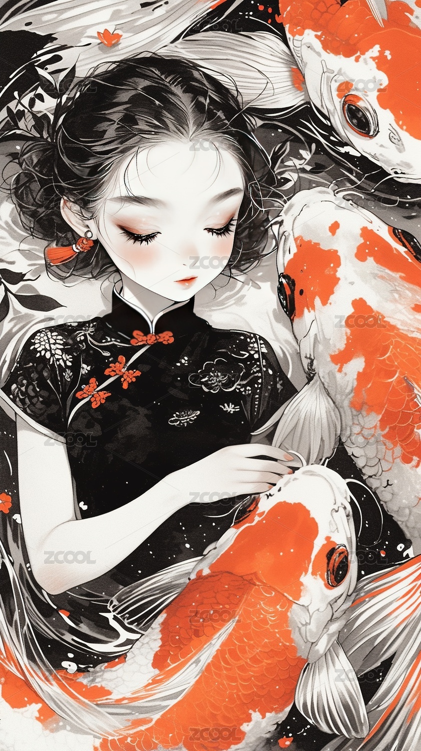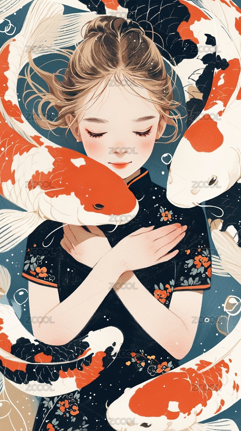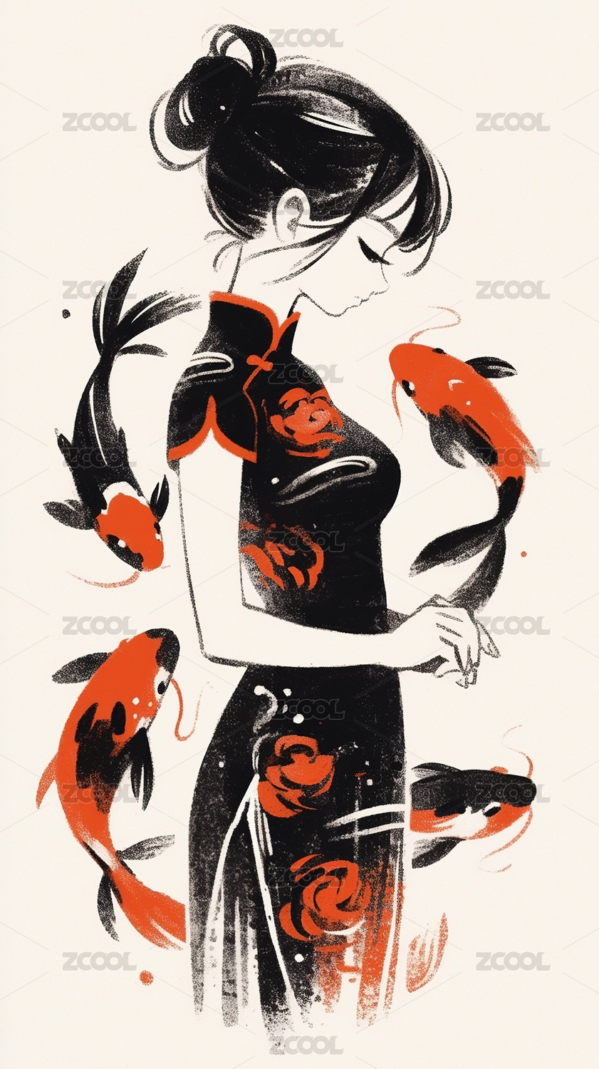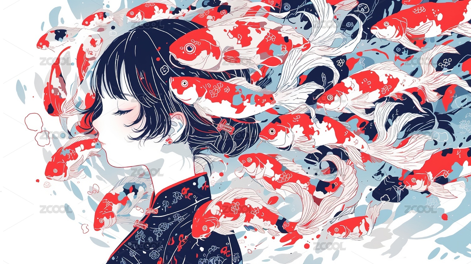 插画,女人,美女,中国文化,汉服,国风,历史服装,古代,肖像,鲤鱼