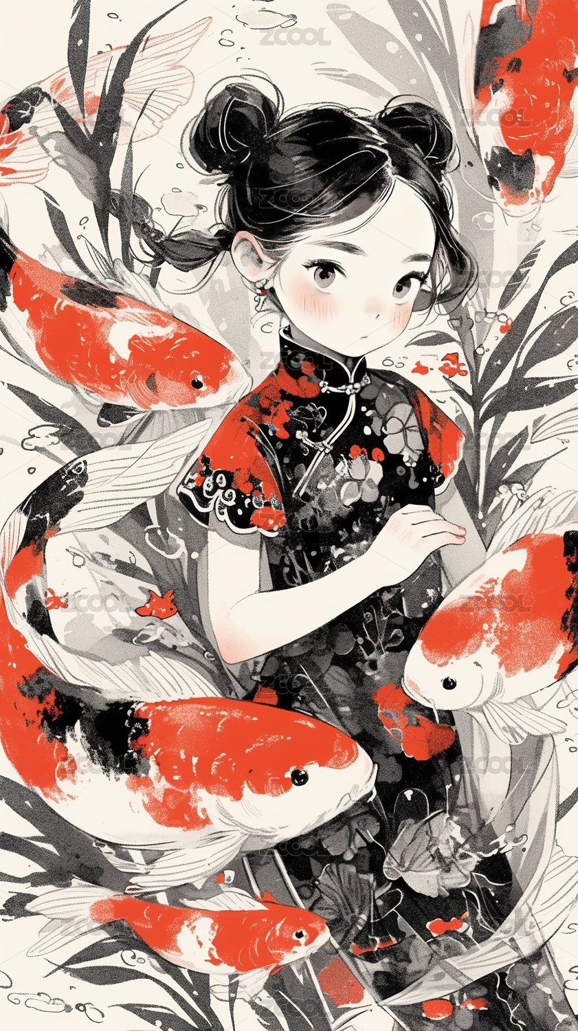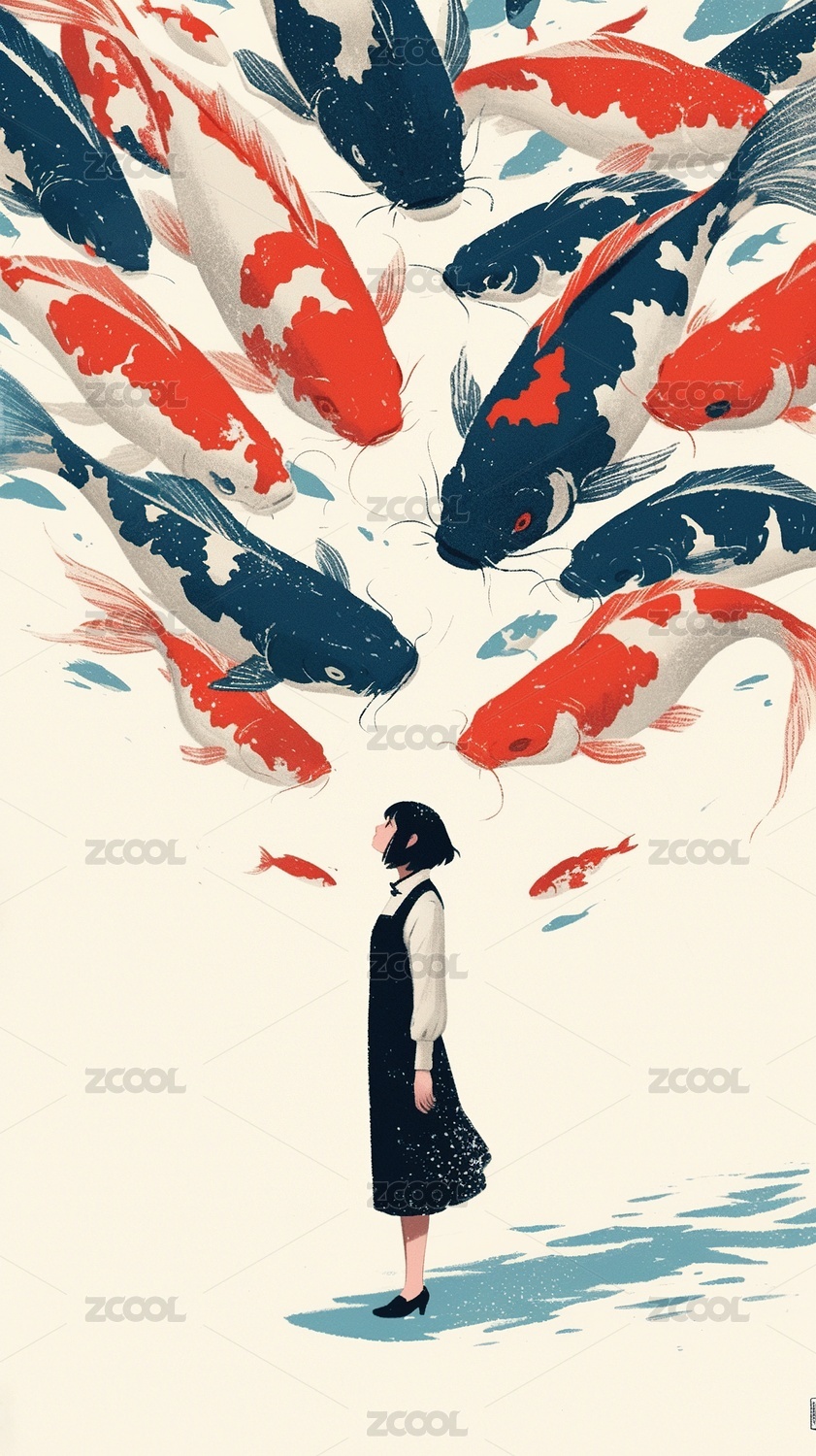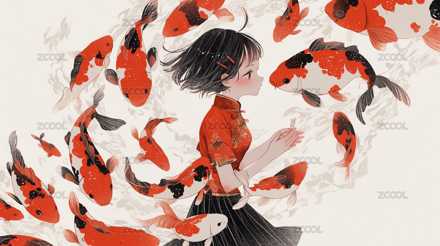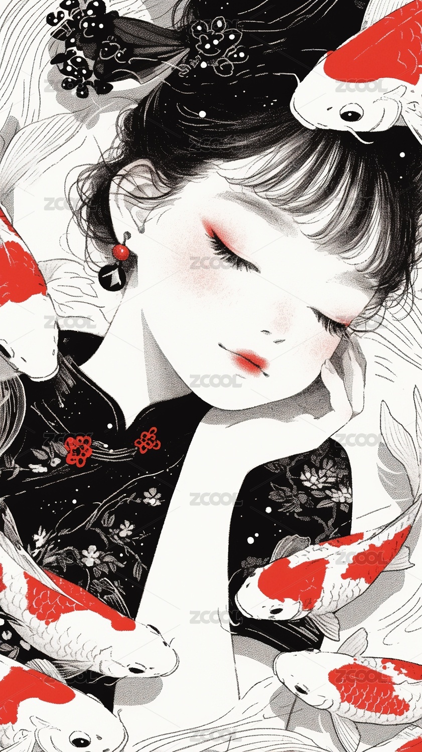 插画,女人,美女,中国文化,汉服,国风,历史服装,古代,肖像,鲤鱼