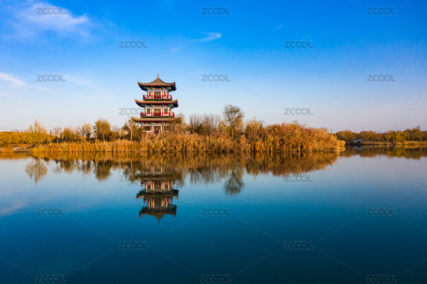 中国甘肃酒泉天马湖湿地公园深秋航拍