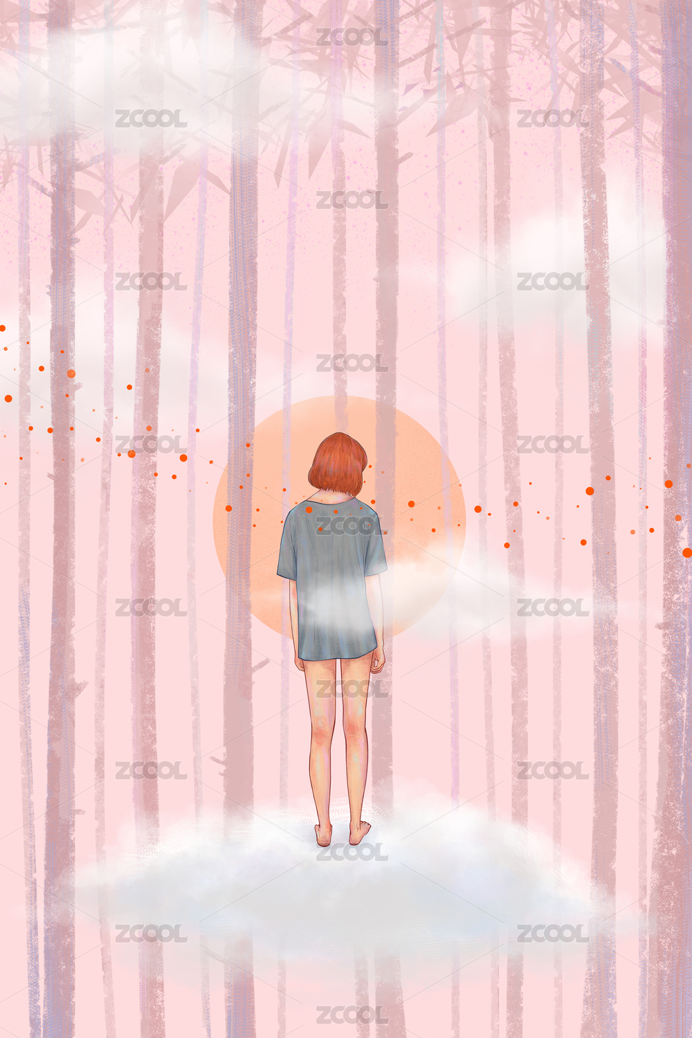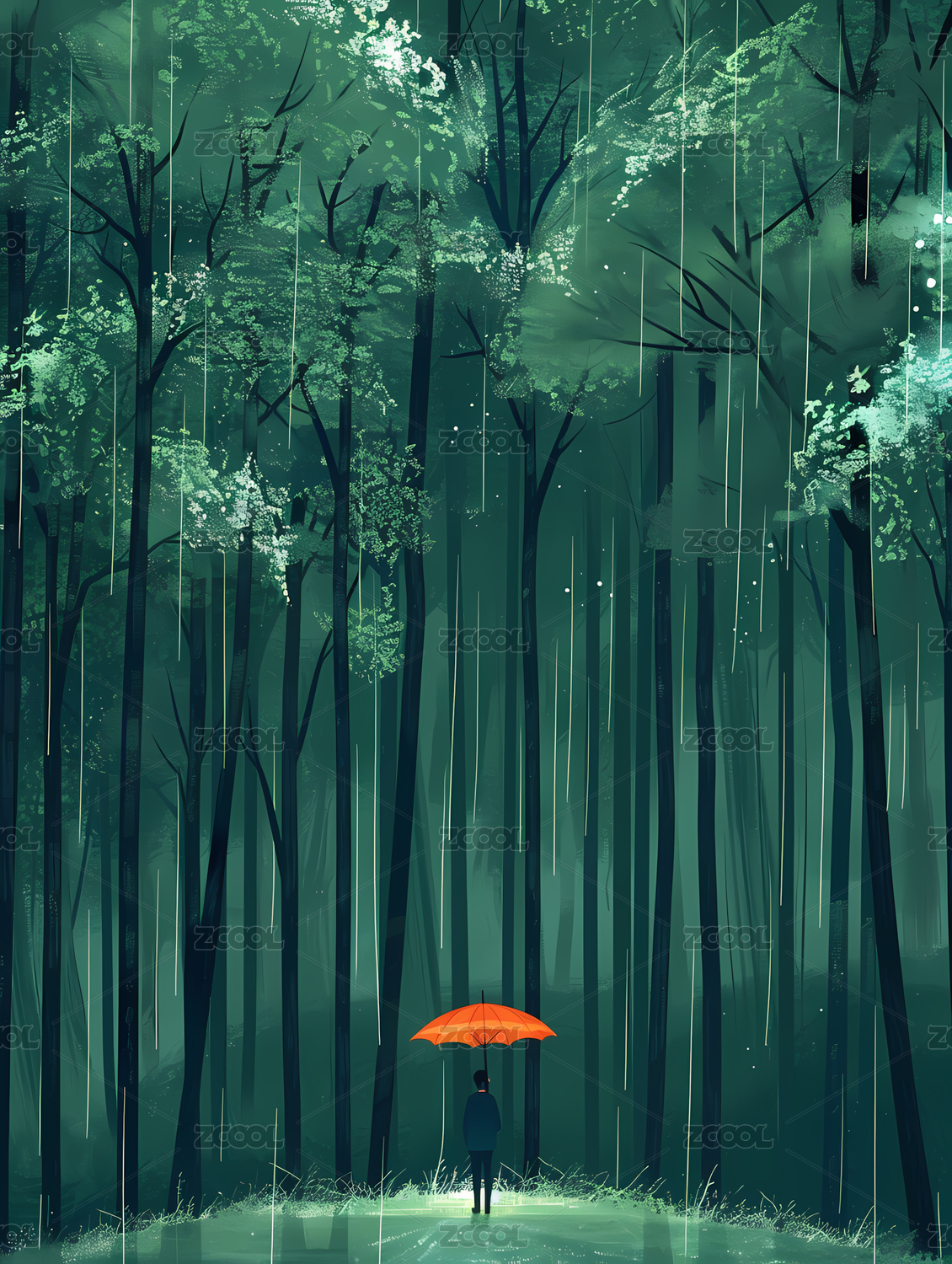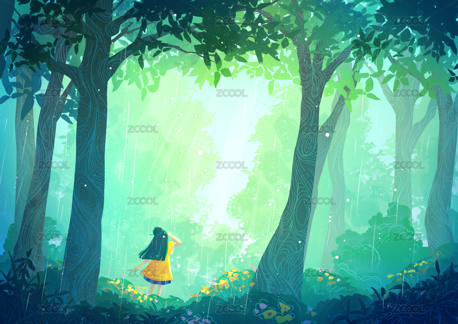 惊蛰绿色森林红衣服小女孩原创插画海报画面