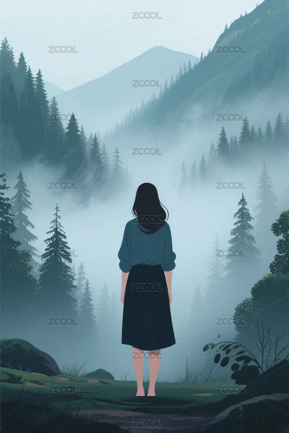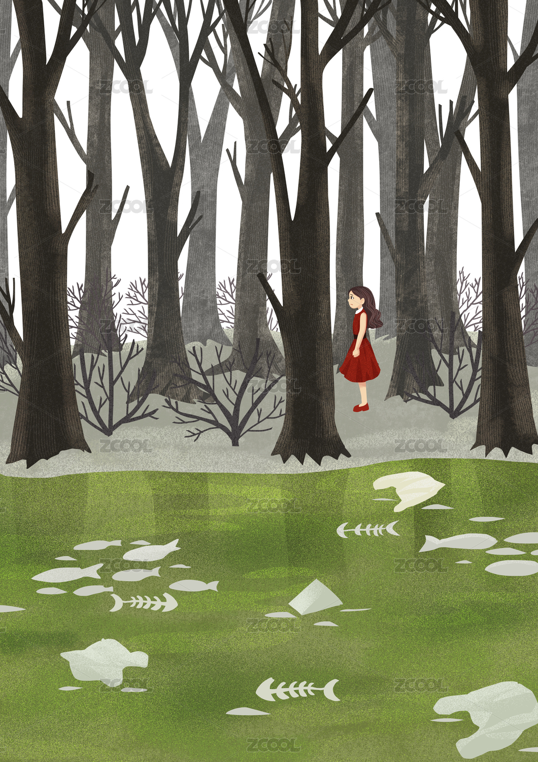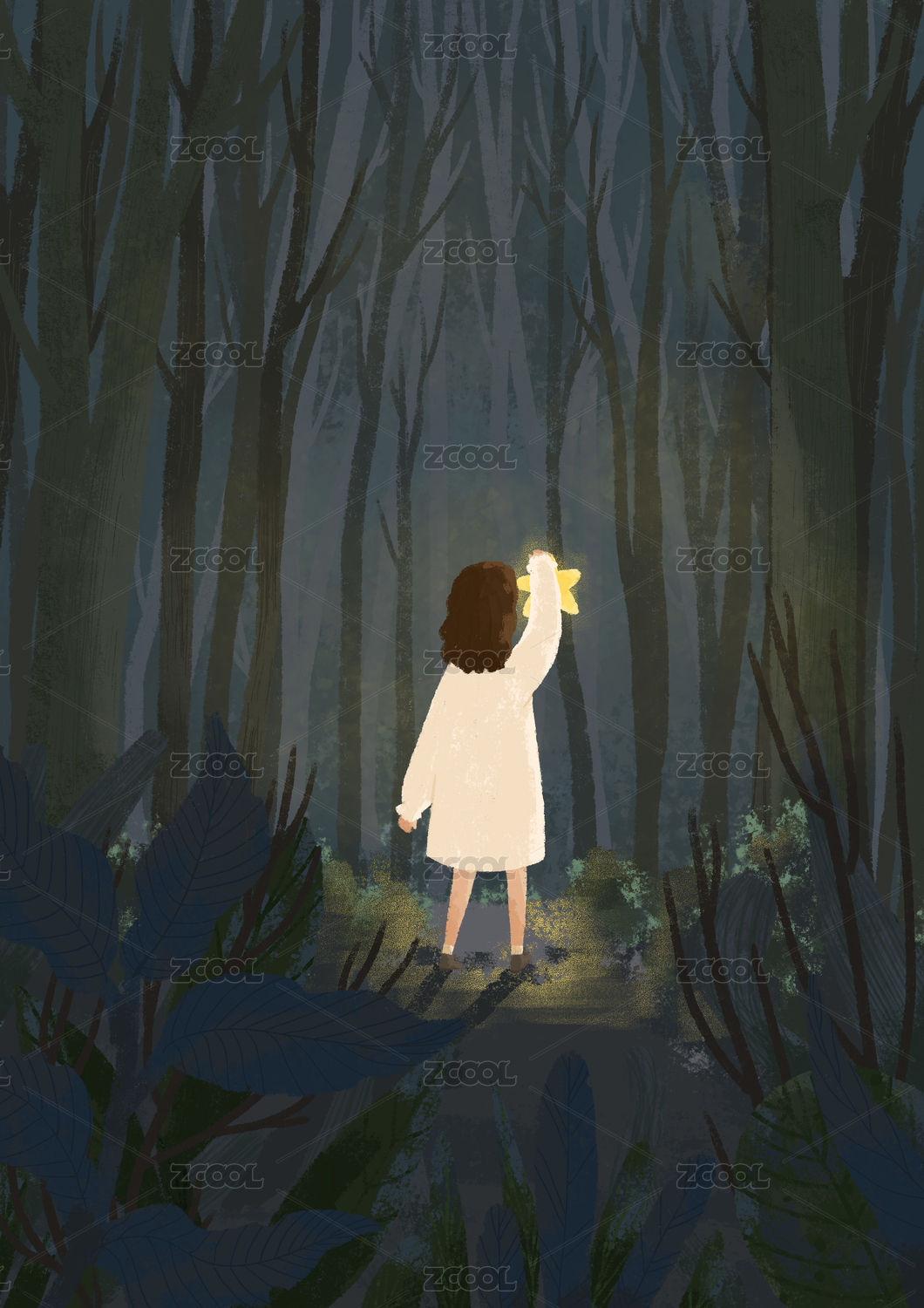 惊蛰绿色森林红衣服小女孩原创插画海报画面