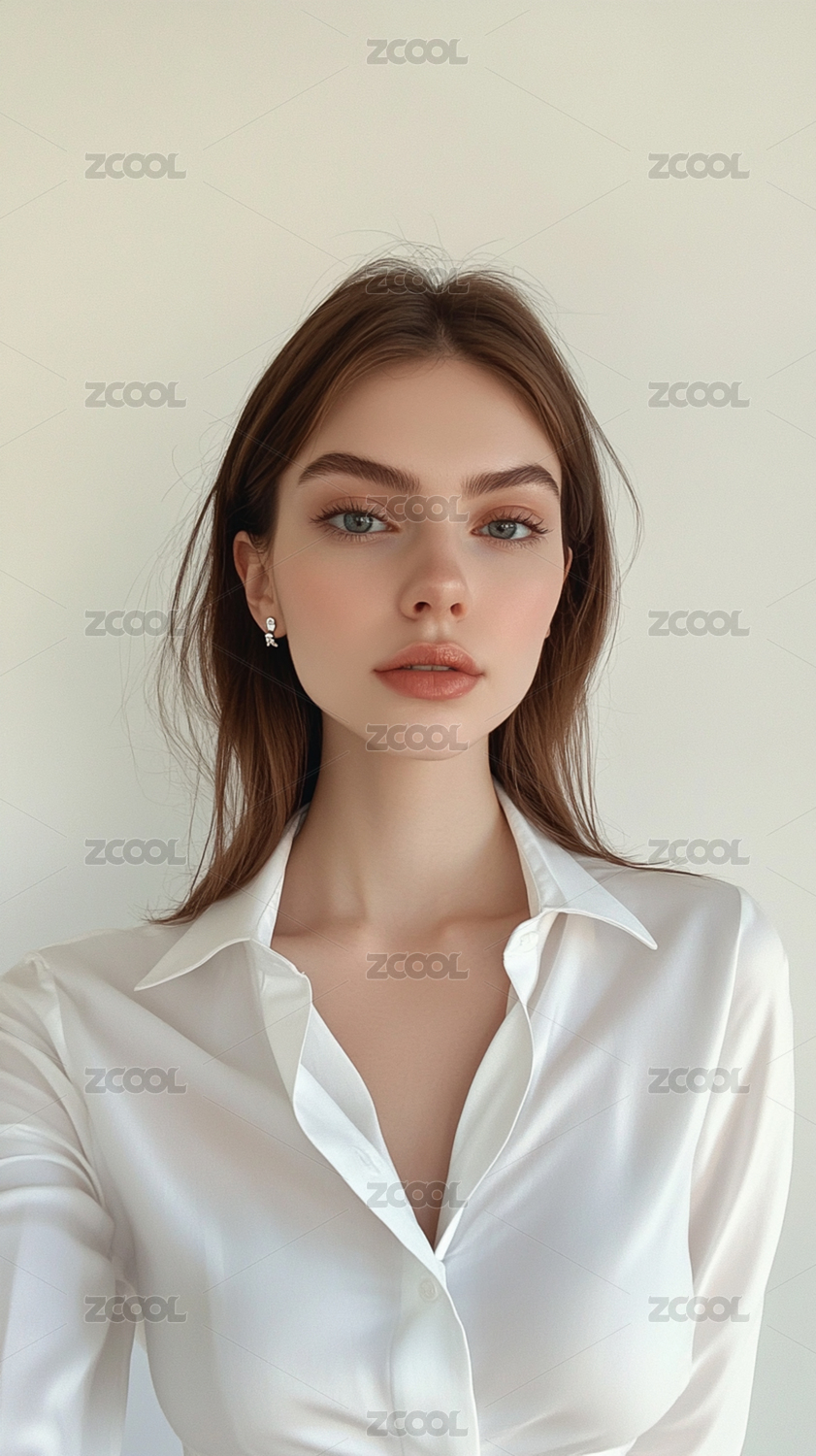 一位棕发女性,盘起发髻,身穿白色衬衫