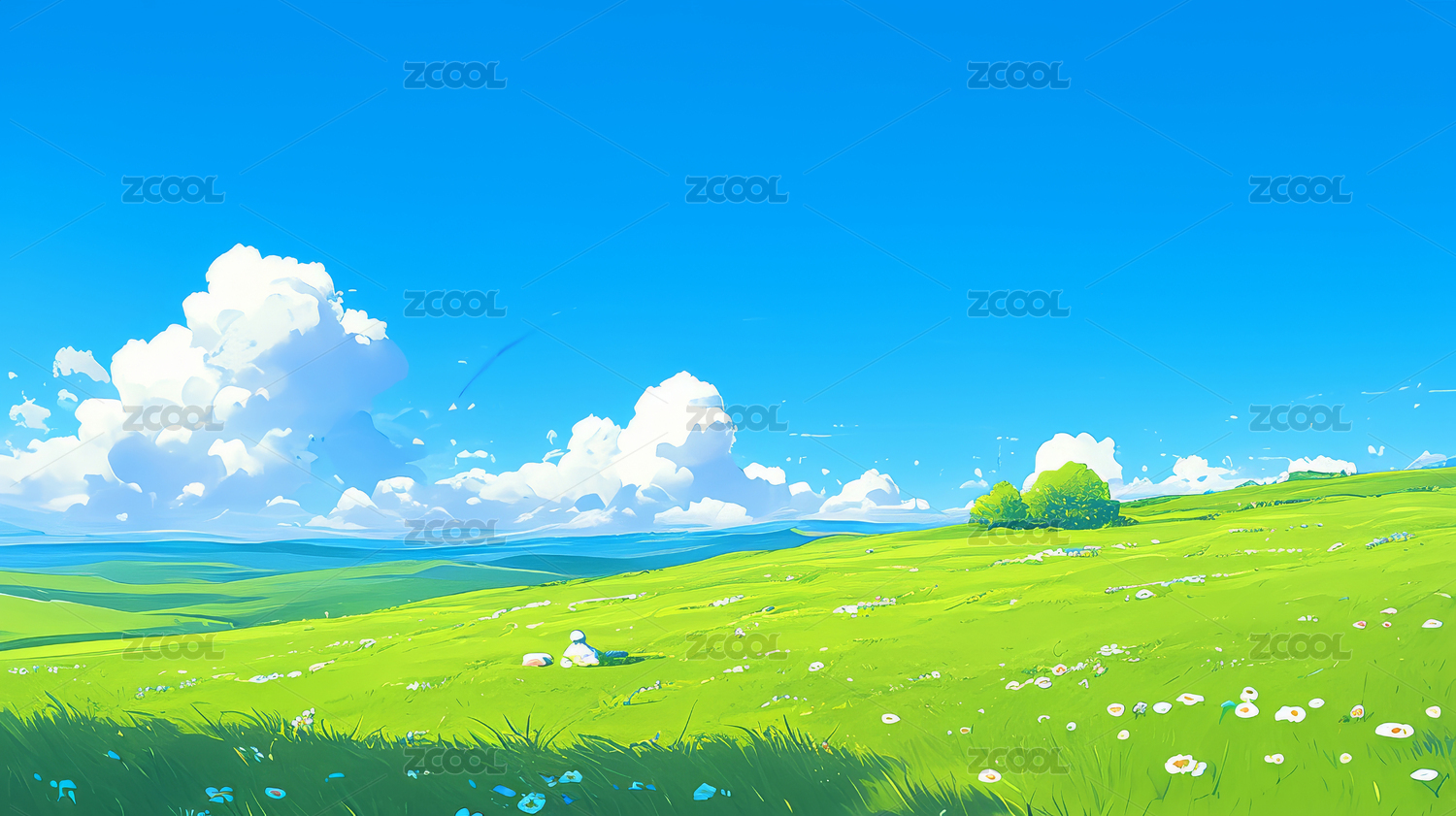 草地风景蓝天白云插画