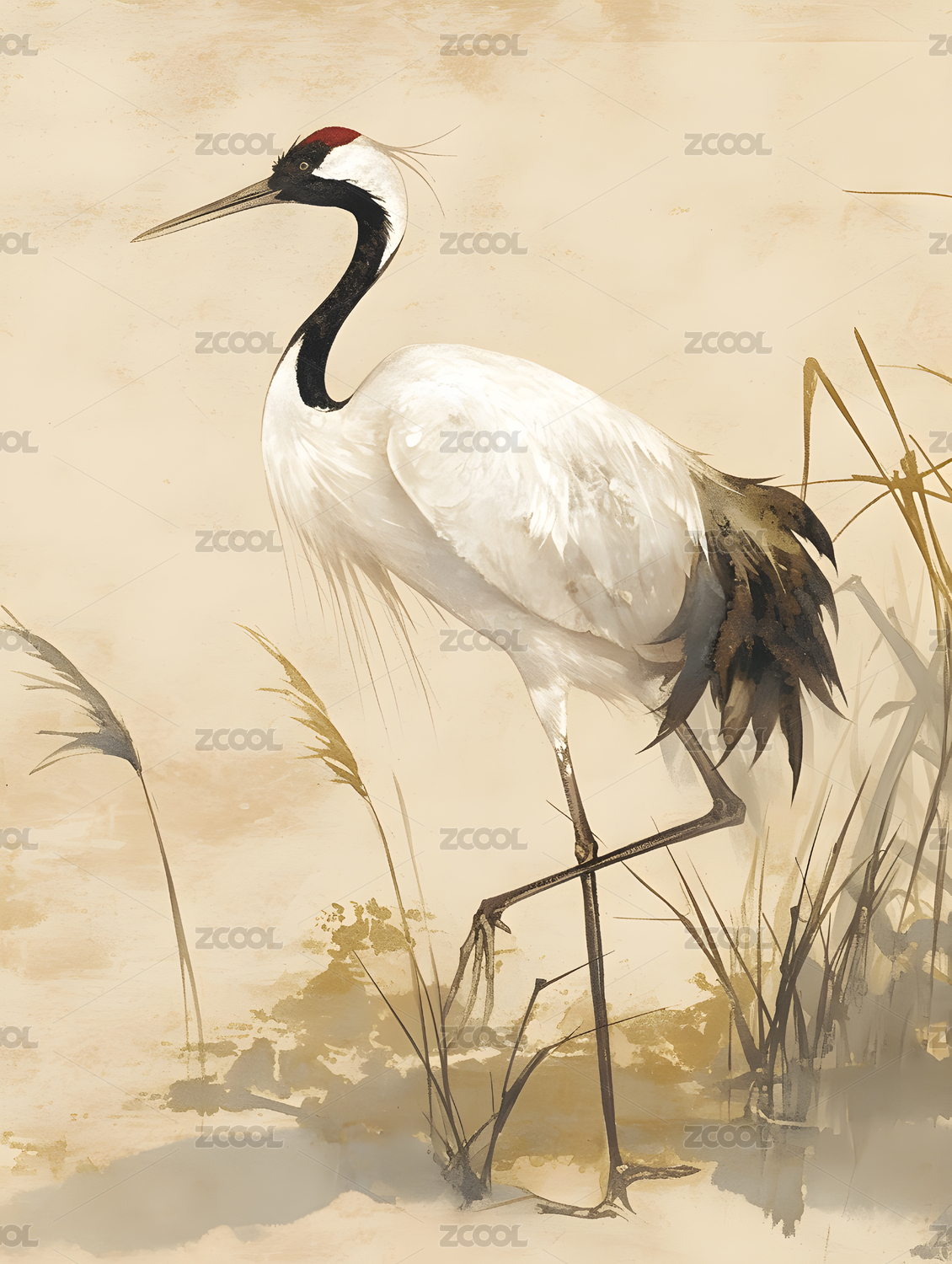 仙鹤,白鹤,丹顶鹤,插画,湖泊,国风,自然,保护,动物,鸟类