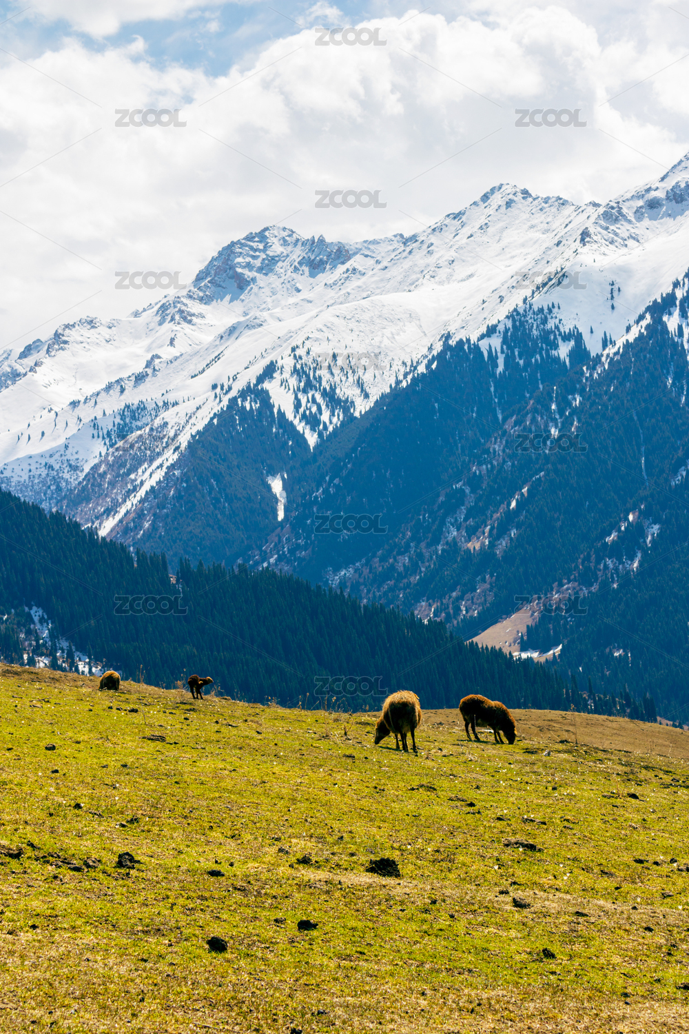 中国新疆伊犁琼库什台村草原高山牧场绵羊