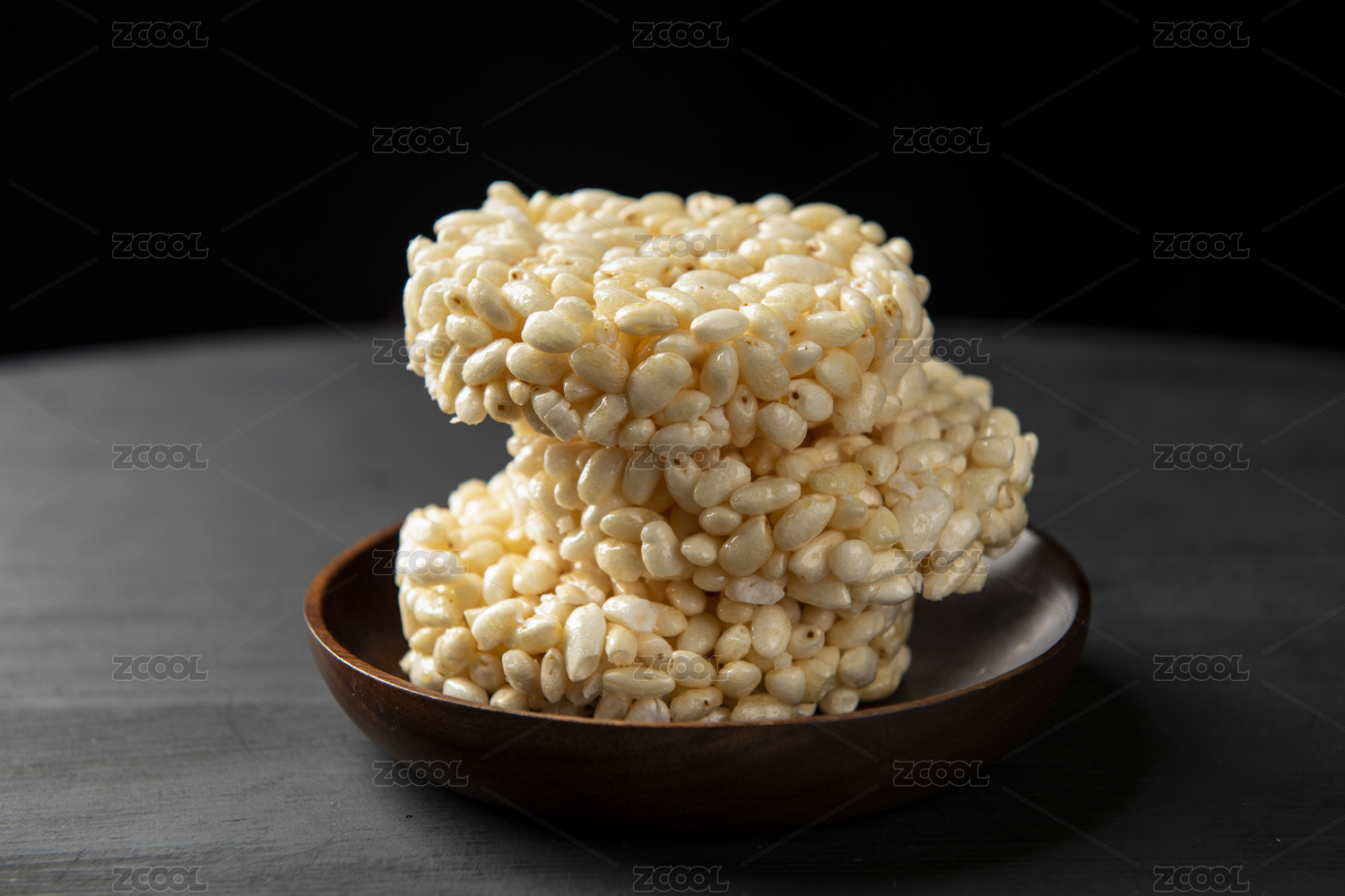 一盘圆饼型米花糖摆放在桌面上