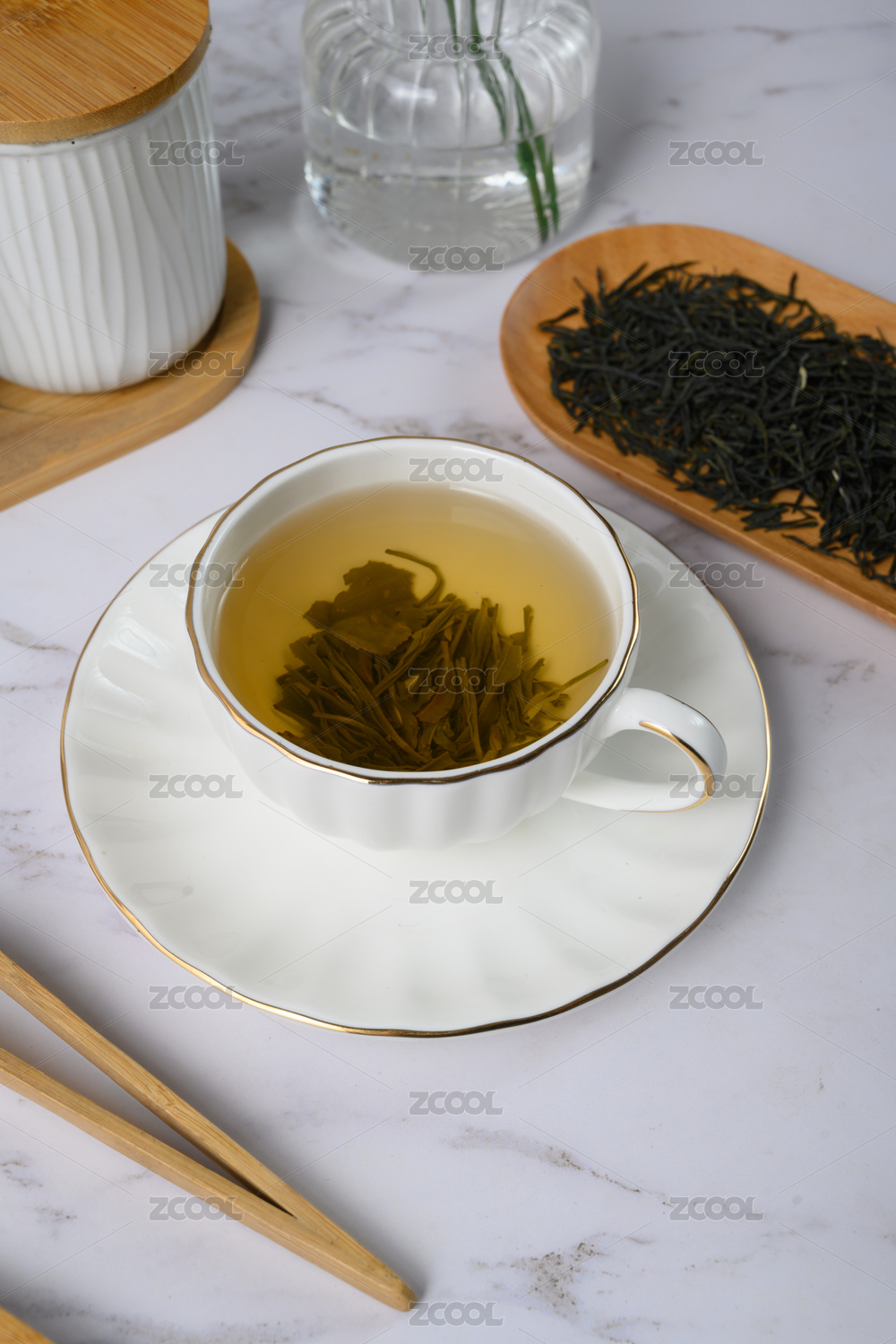 桌面上的杯子里的甘甜可口的雀舌茶