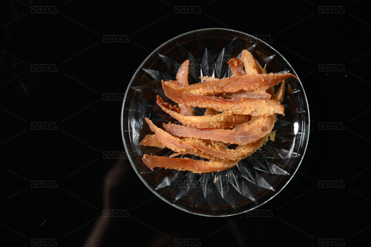 桌面上的盘子里的美味可口的油炸鱿鱼丝