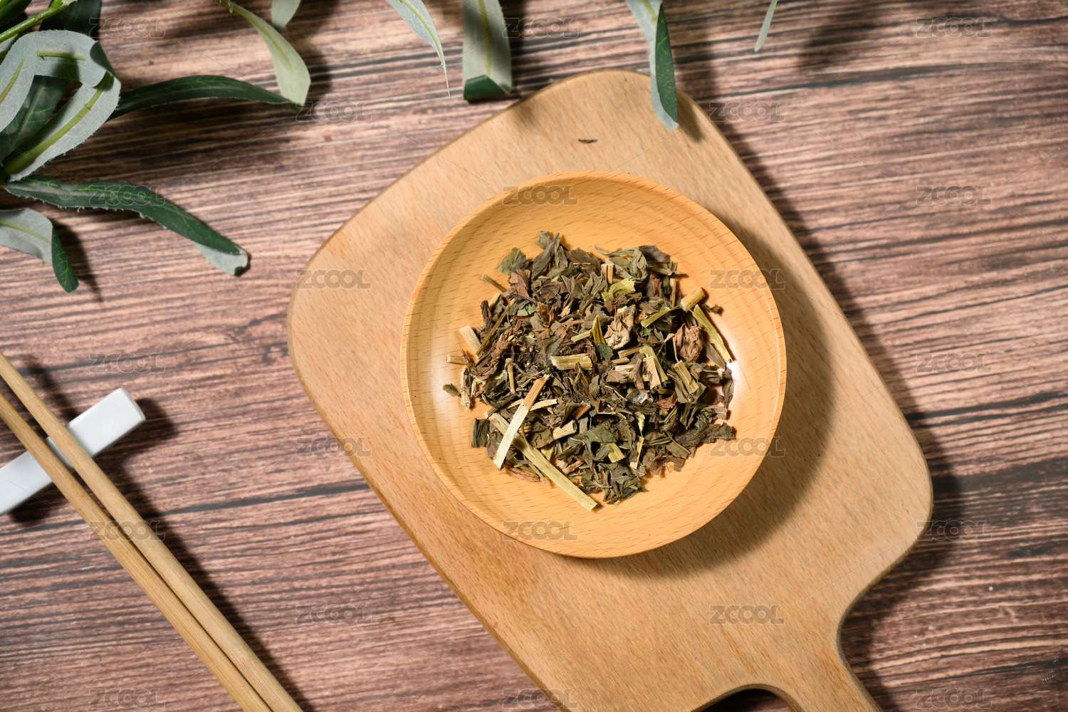 桌面上的盘子里的干爽的赶黄草茶