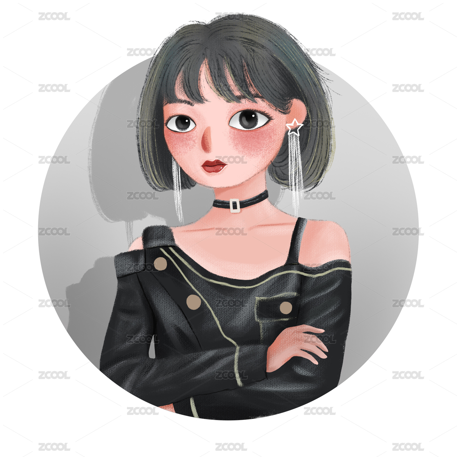 一张圆形、灰色背景的短发女生图片
