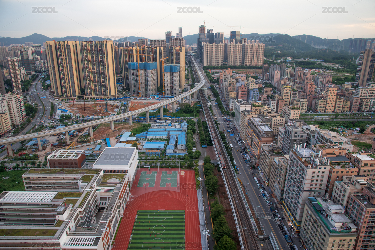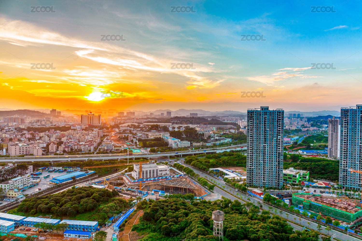 中国广东省深圳郊区住宅建筑及高架桥傍晚风光