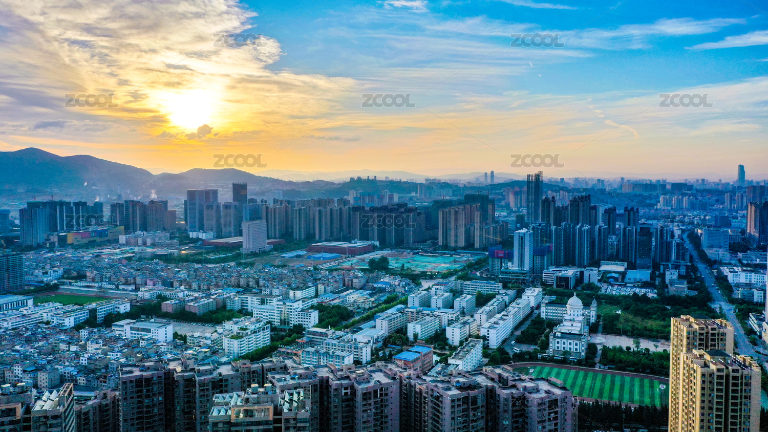 航拍云南昆明市城市日出