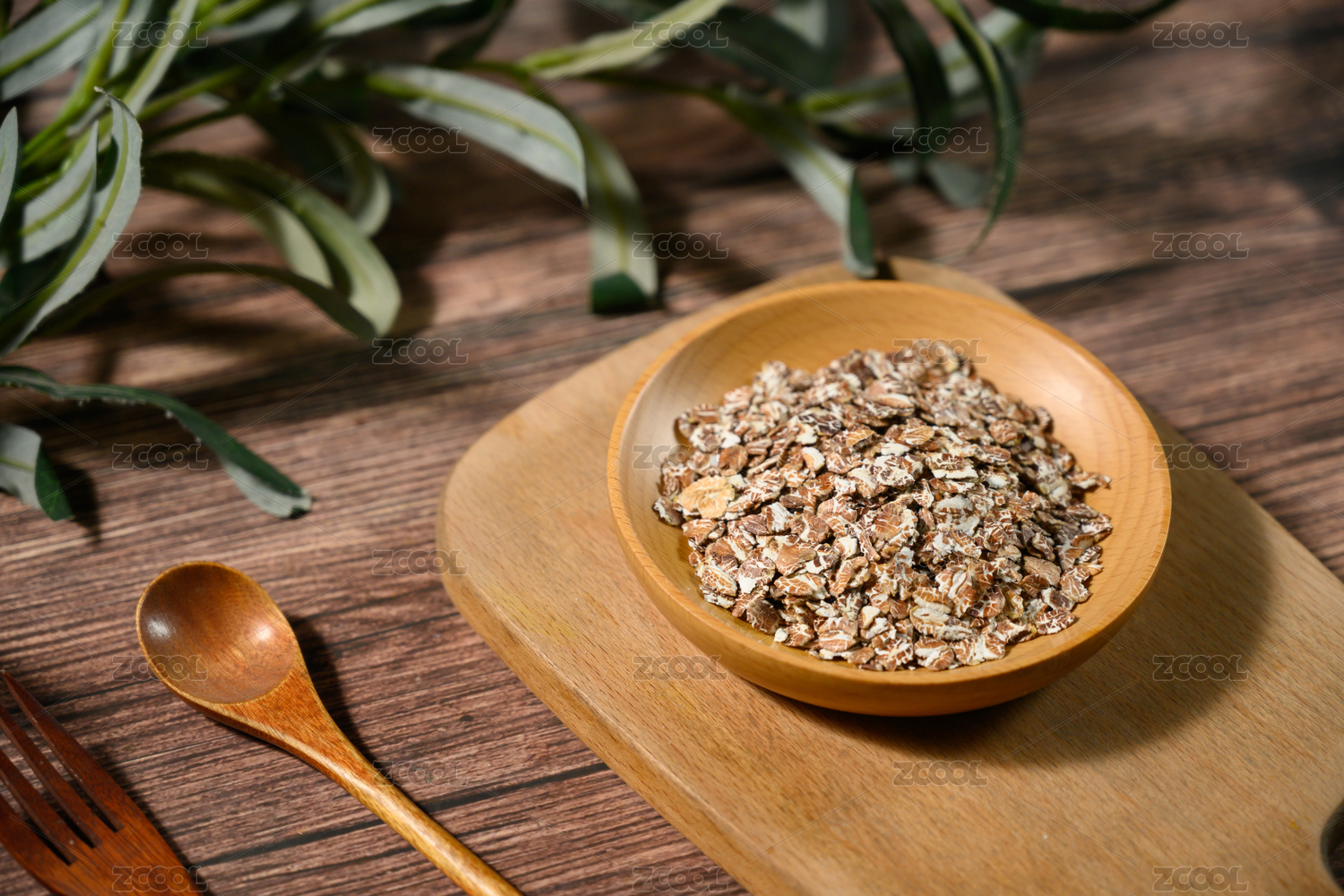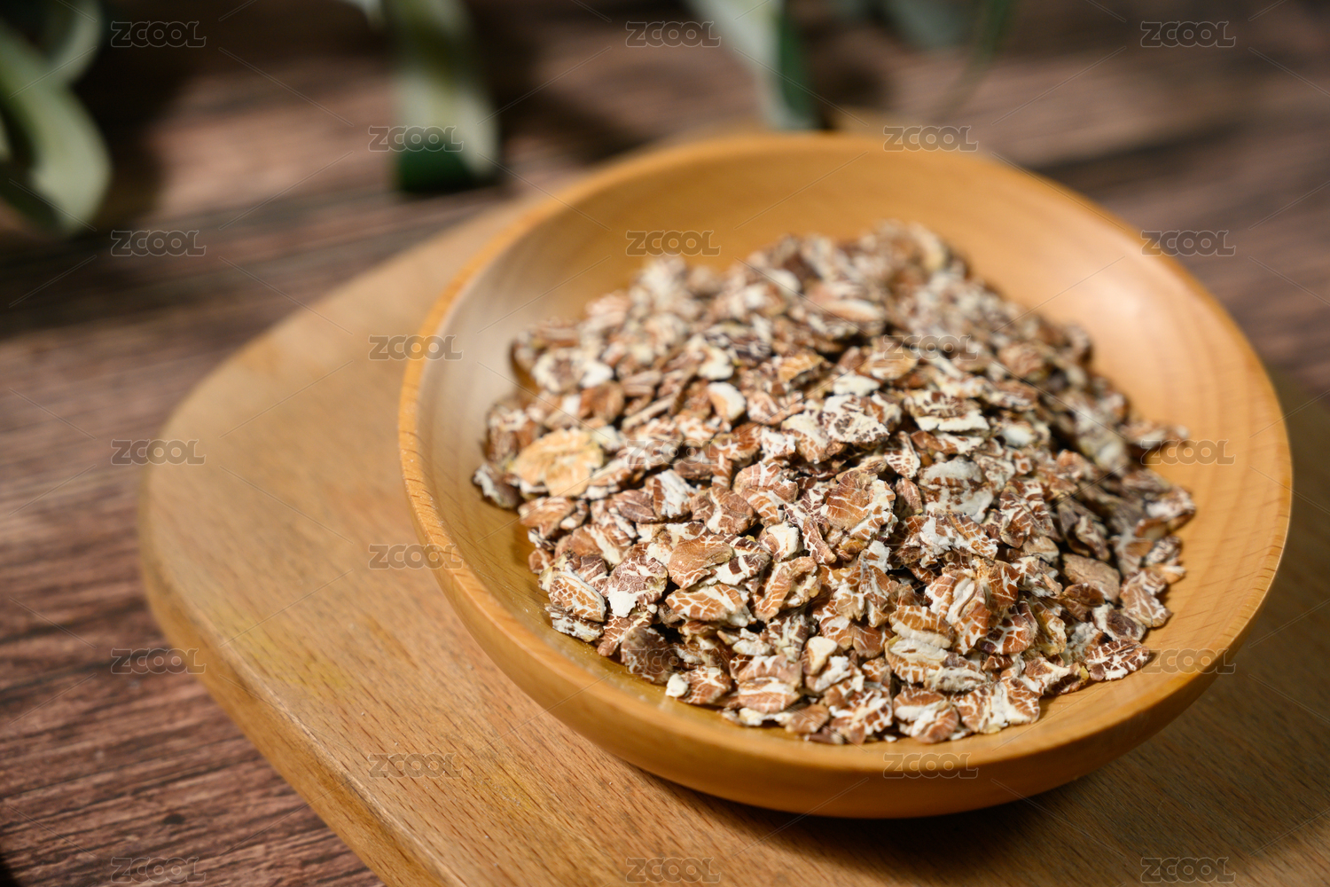 桌面上的木纹盘子里的美味可口的麦片