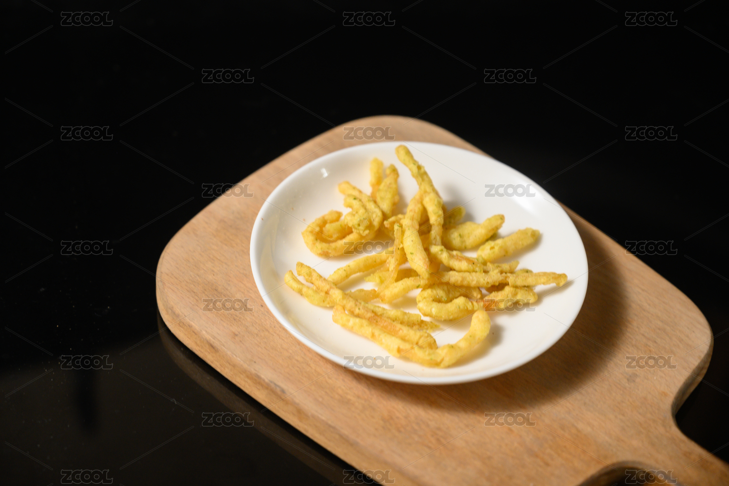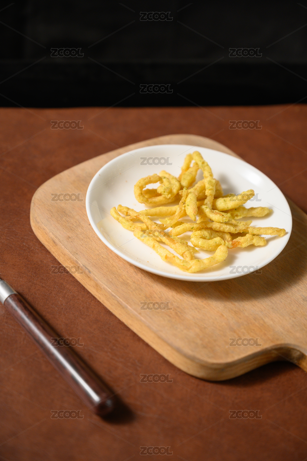 桌面上的盘子里的美味可口的油炸鱿鱼丝