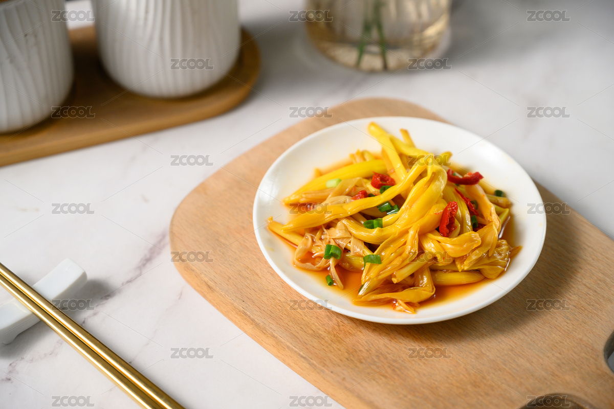 桌面上的盘子里的美味可口的凉拌黄花菜