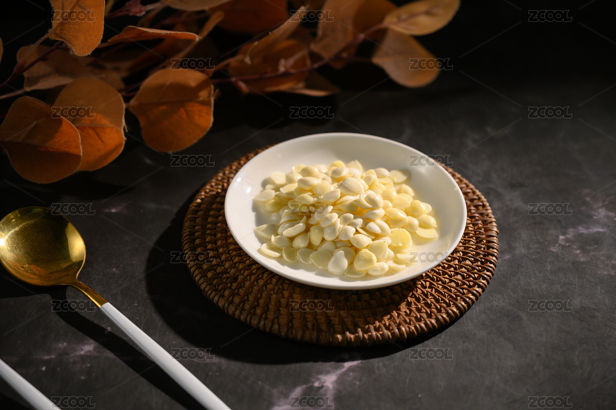 桌面上的盘子里的美味可口的新鲜杏仁