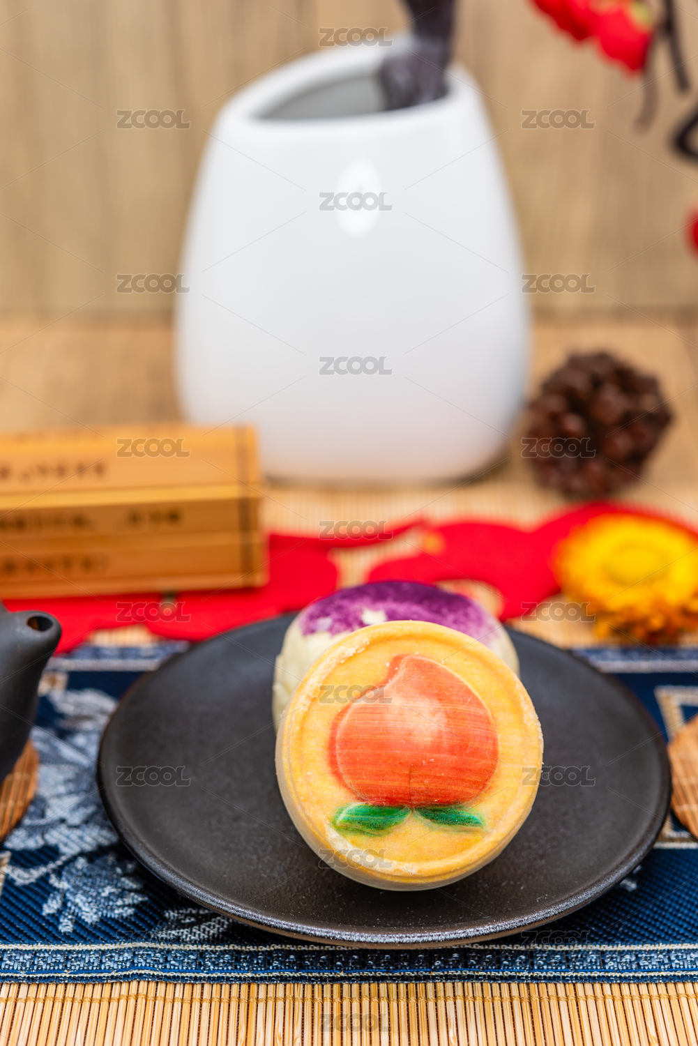 室内棚拍竹简茶具中国风背景前一盘桃形糕点