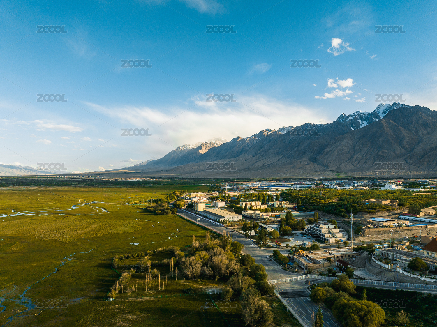 中国,新疆,喀什,塔什库尔干县,日出,山,城镇,清晨,航拍