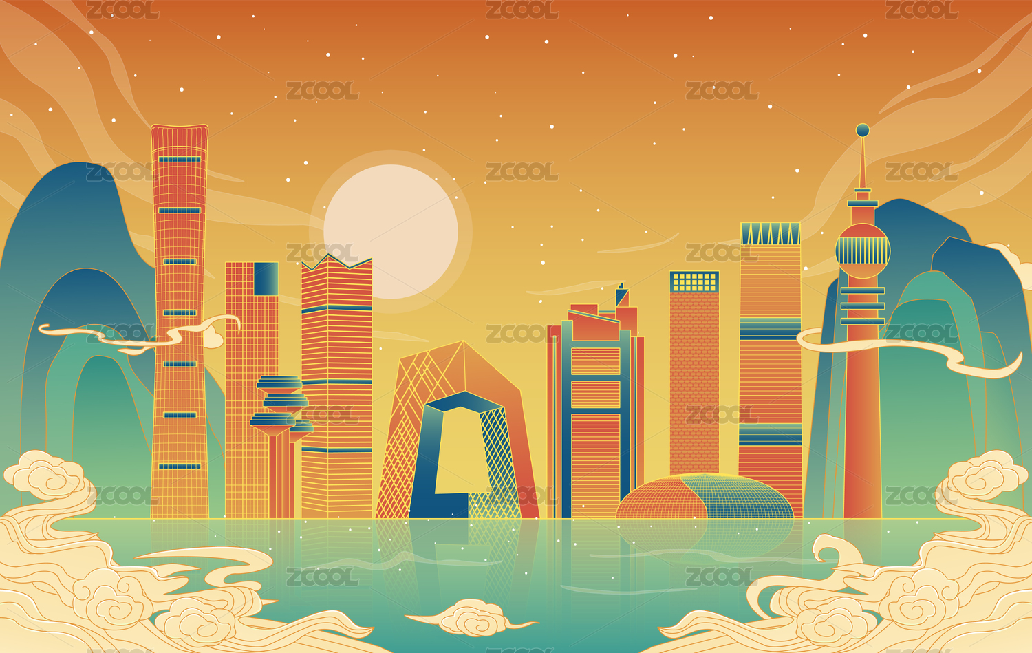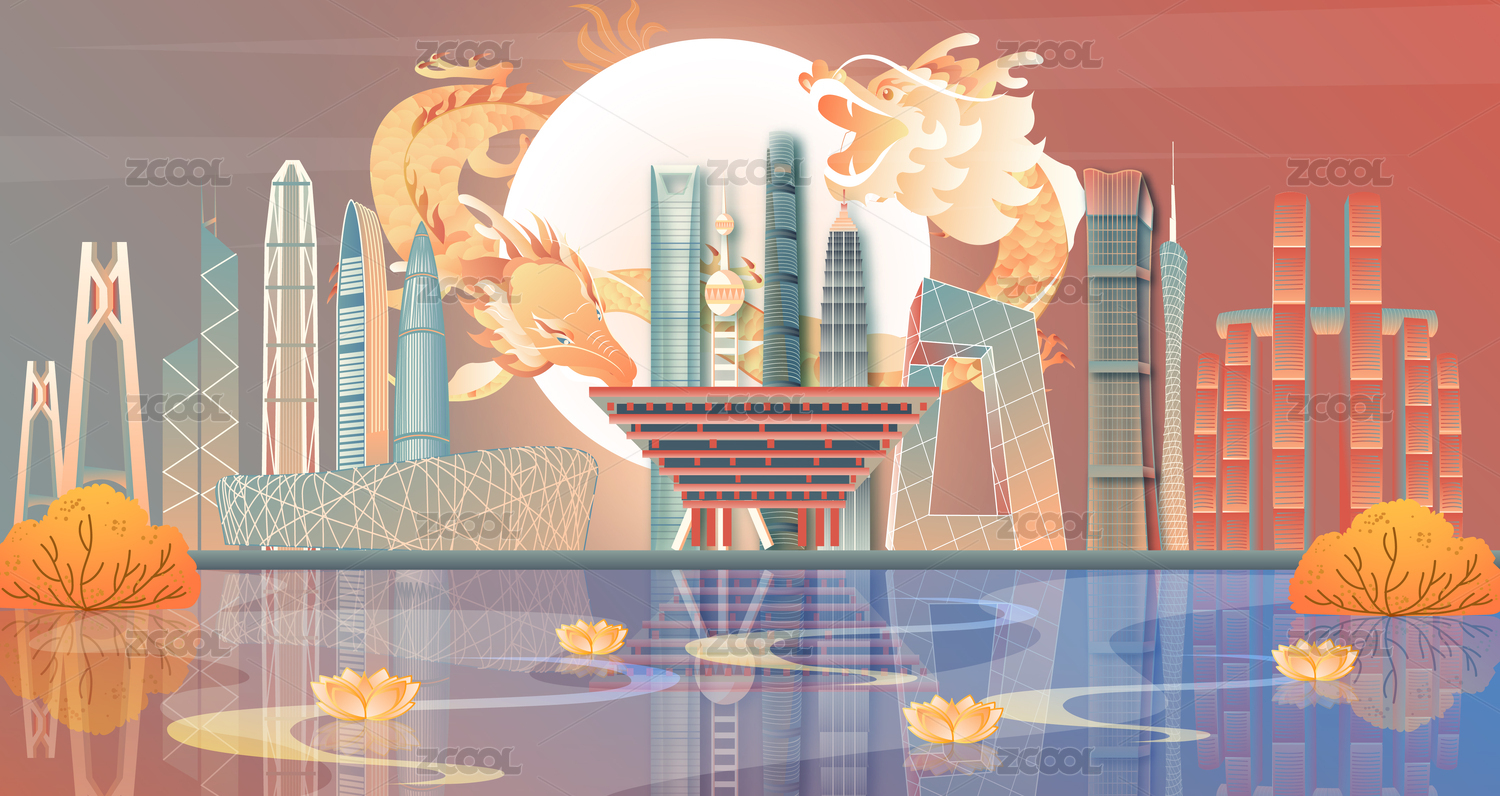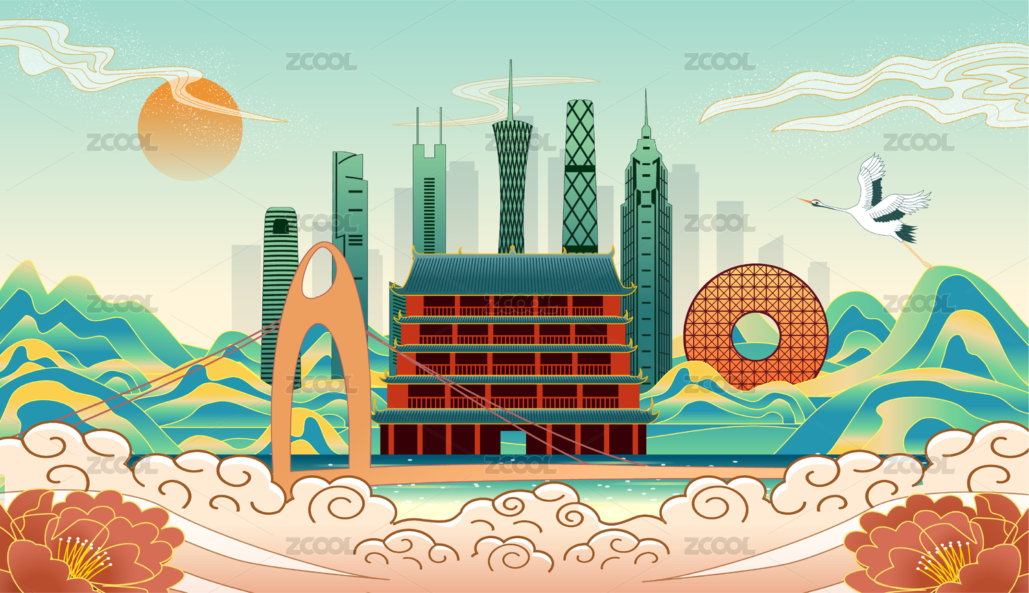国潮风,建筑,插画,中国文化,国风,祥云,城市,旅行,商务,大湾区