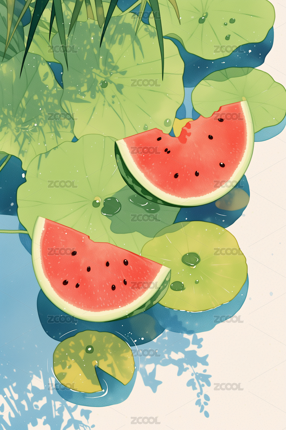 水面上的荷叶西瓜夏至国风插画