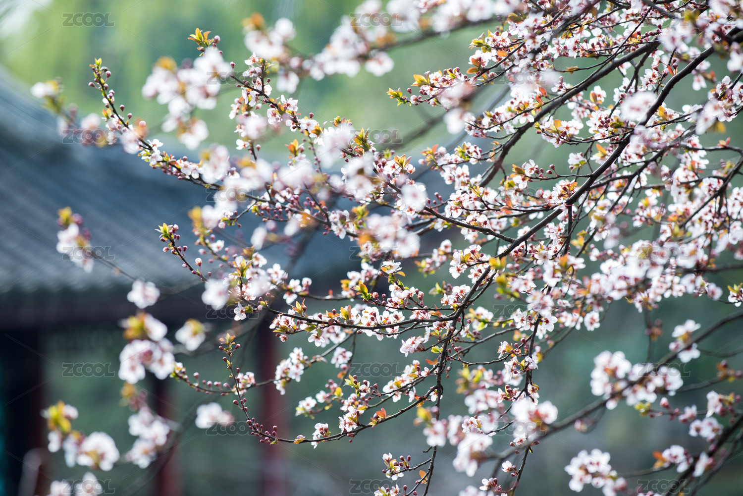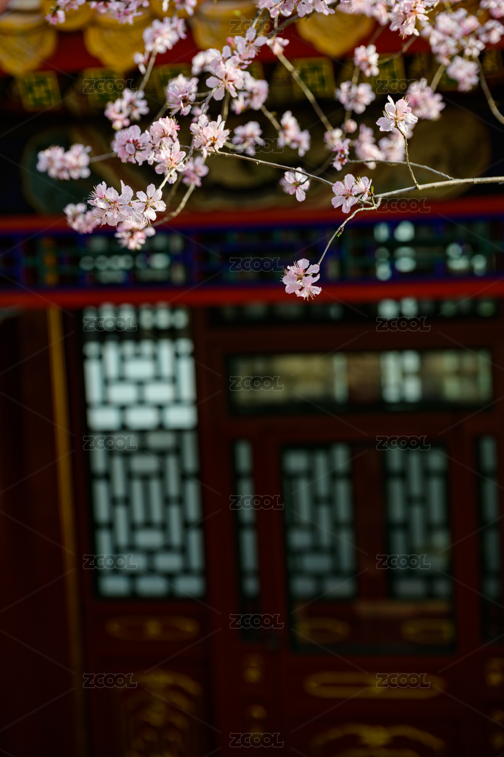 春天古建筑前面盛开的桃花