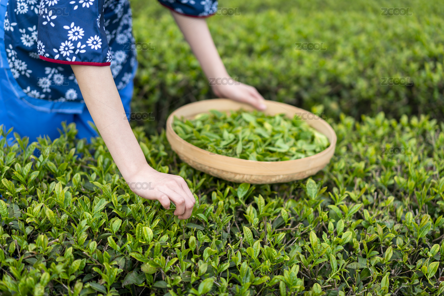 一双采摘茶叶的女性的双手