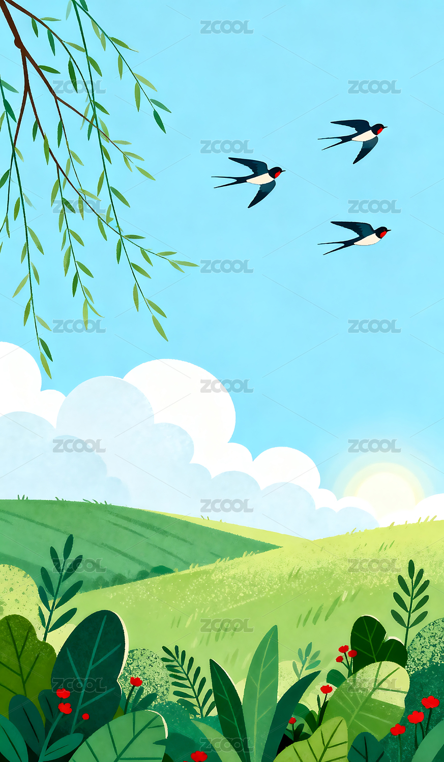 插画,节气,二十四节气,插图,叶子,草地,花,树枝,燕子,立春