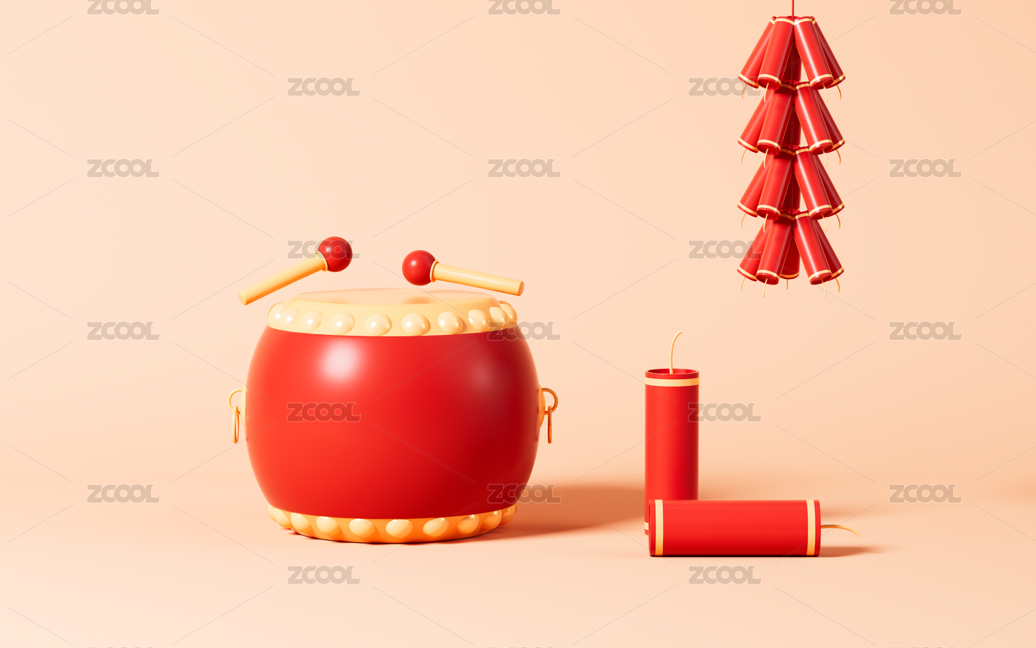 过年锣鼓与鞭炮场景3D渲染