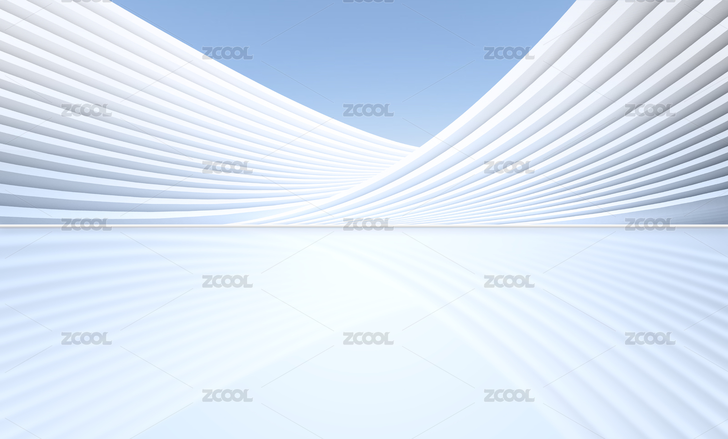 白色现代线条建筑与倒影路面有蓝色天空背景