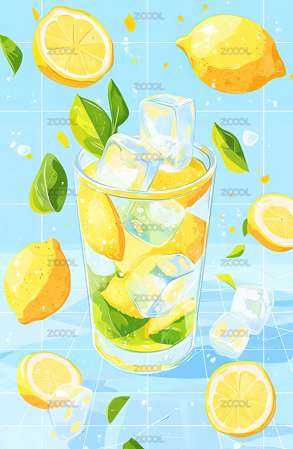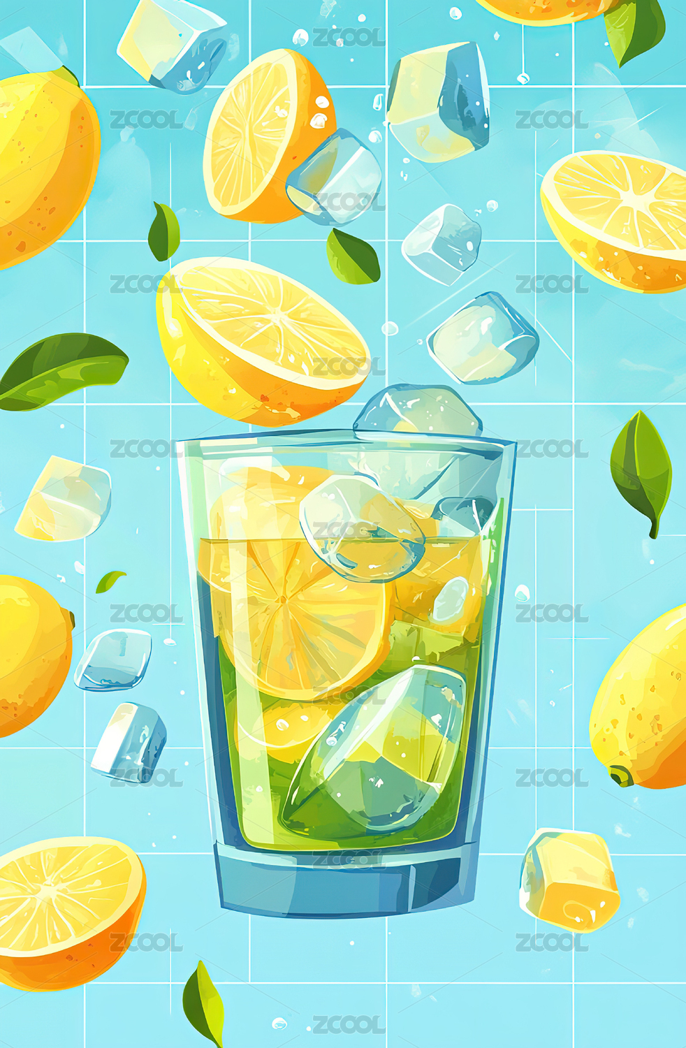 套着游泳圈漂浮在水面上的夏日冷饮,创意插