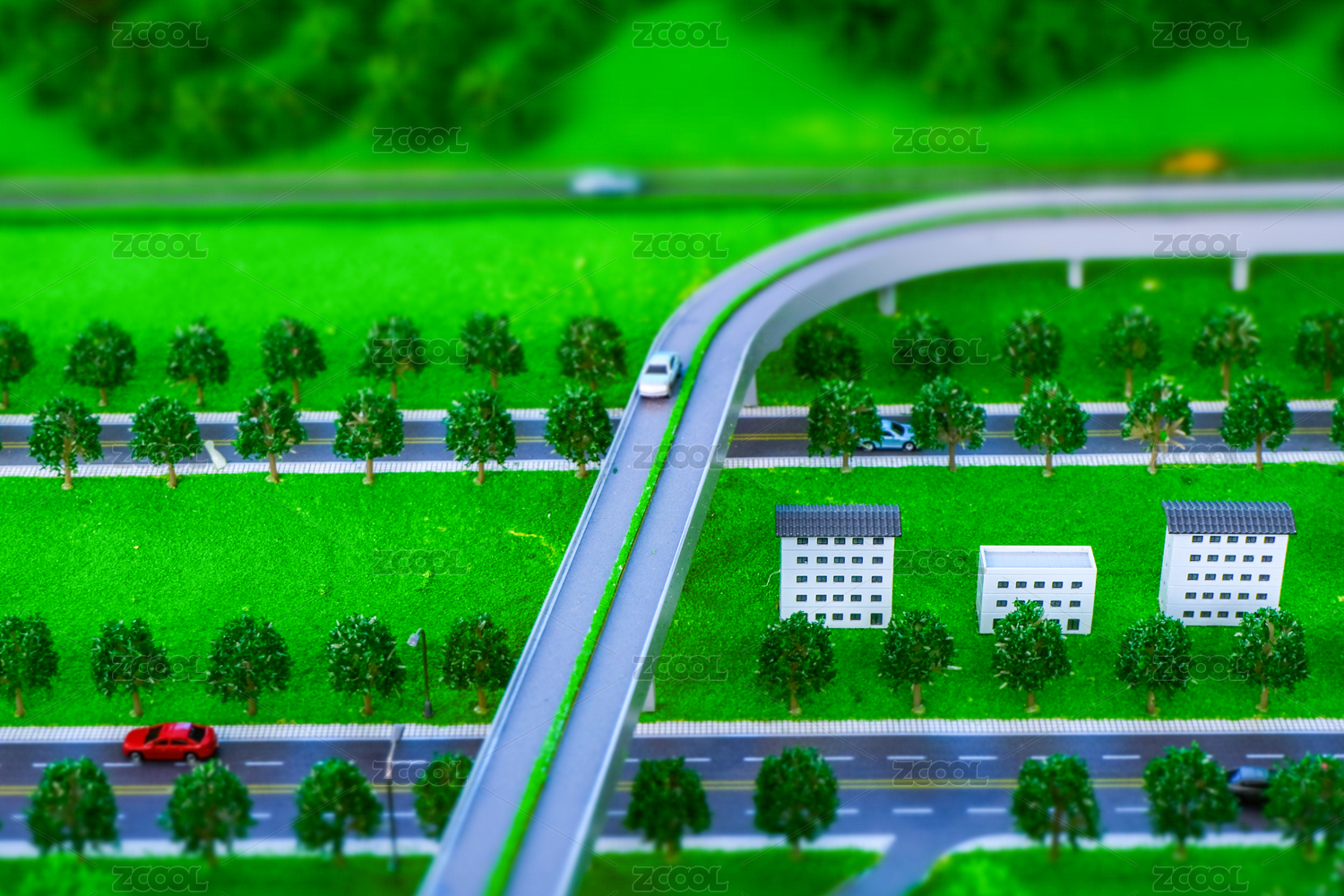 模糊的树木和道路沙盘模型