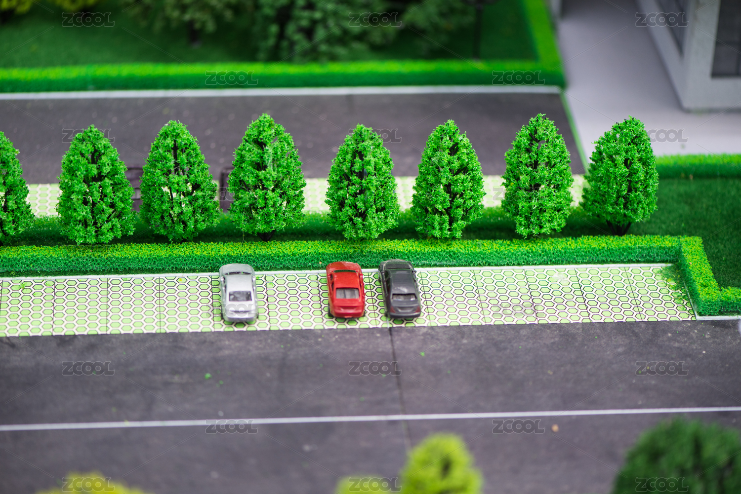 微缩的道路和路边的绿化带沙盘模型