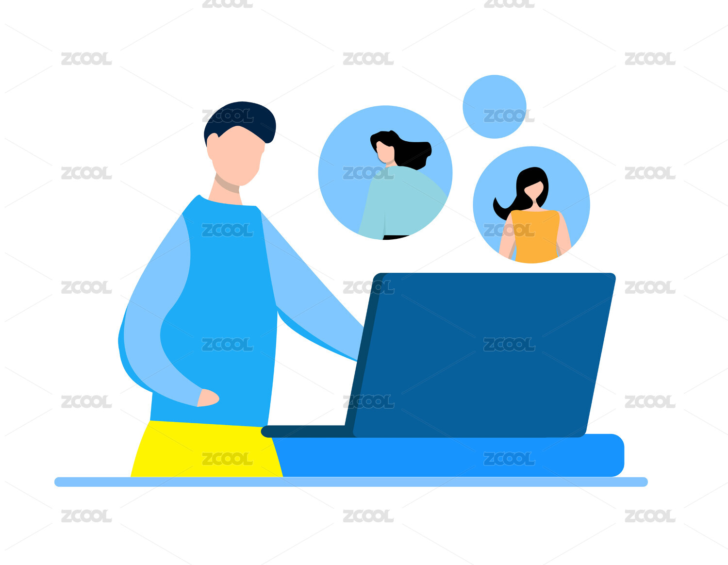 工作中的白领远程协作提高效率,矢量扁平概念清新插画