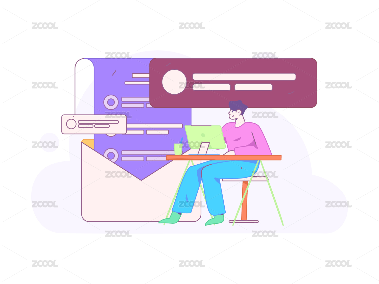 白领男子通过电脑查看邮件获取更多信息,概念插画