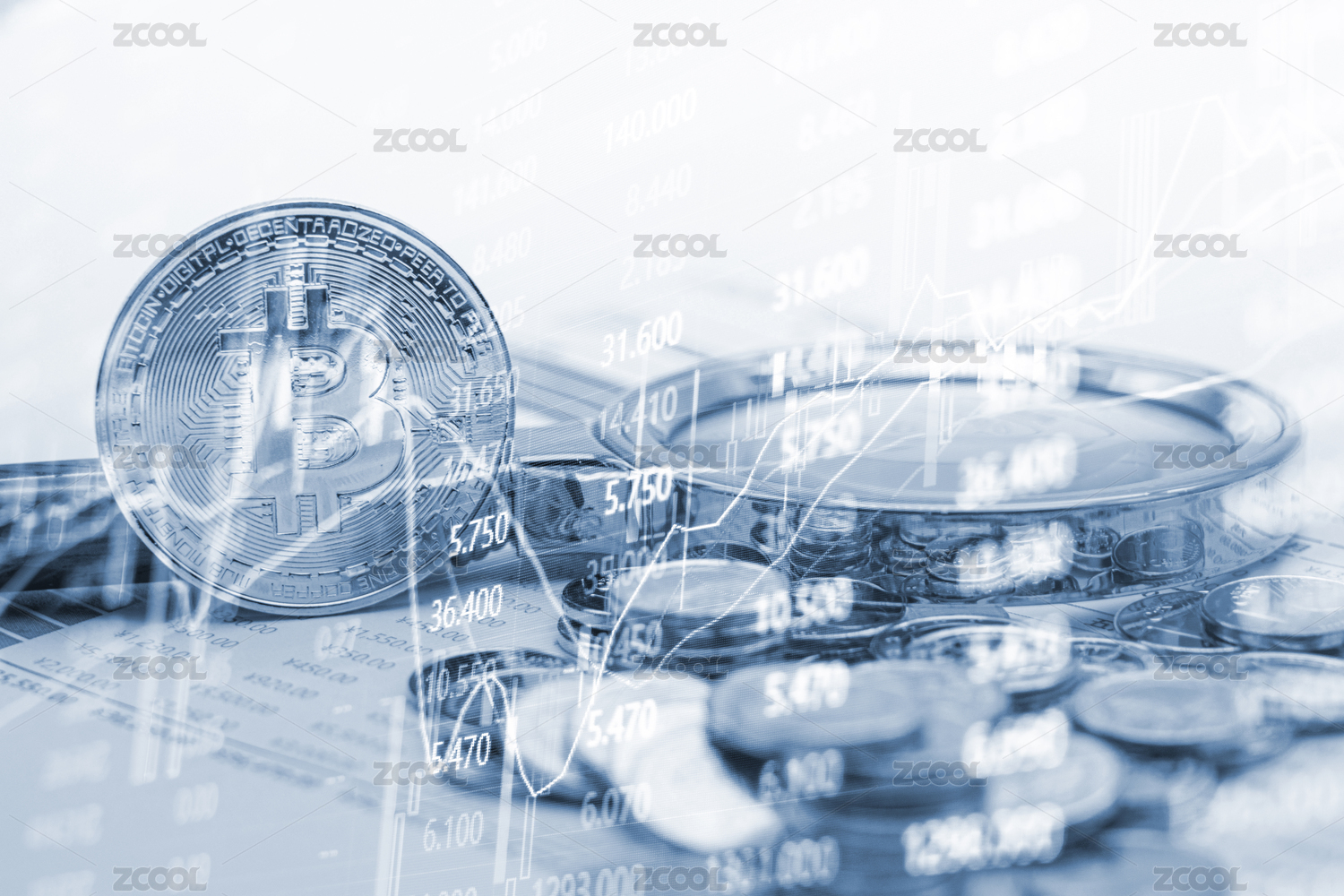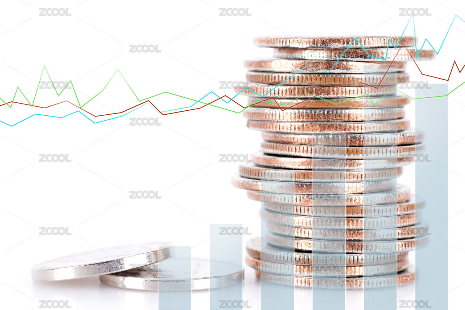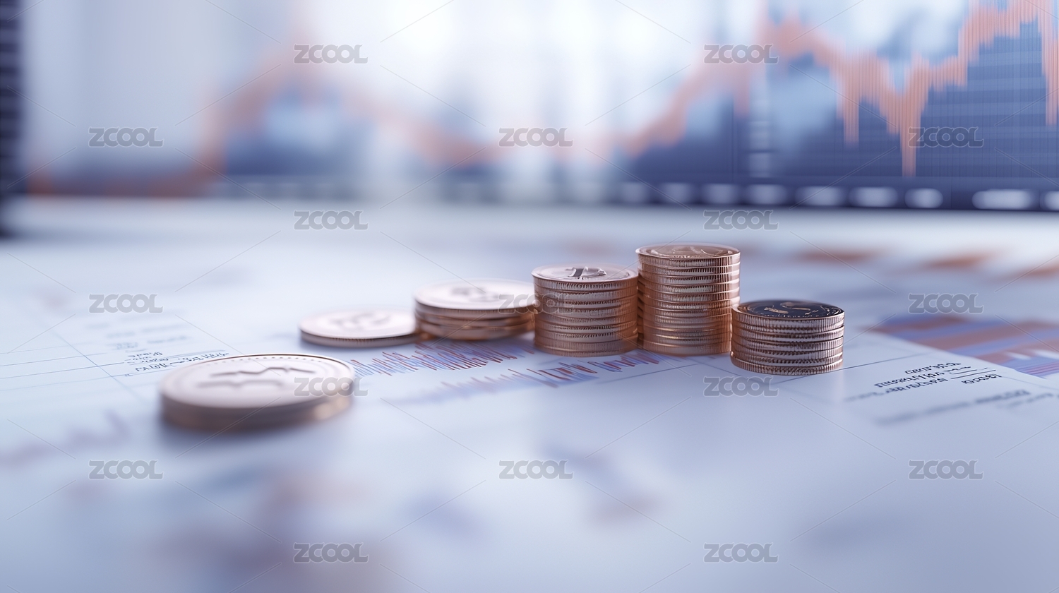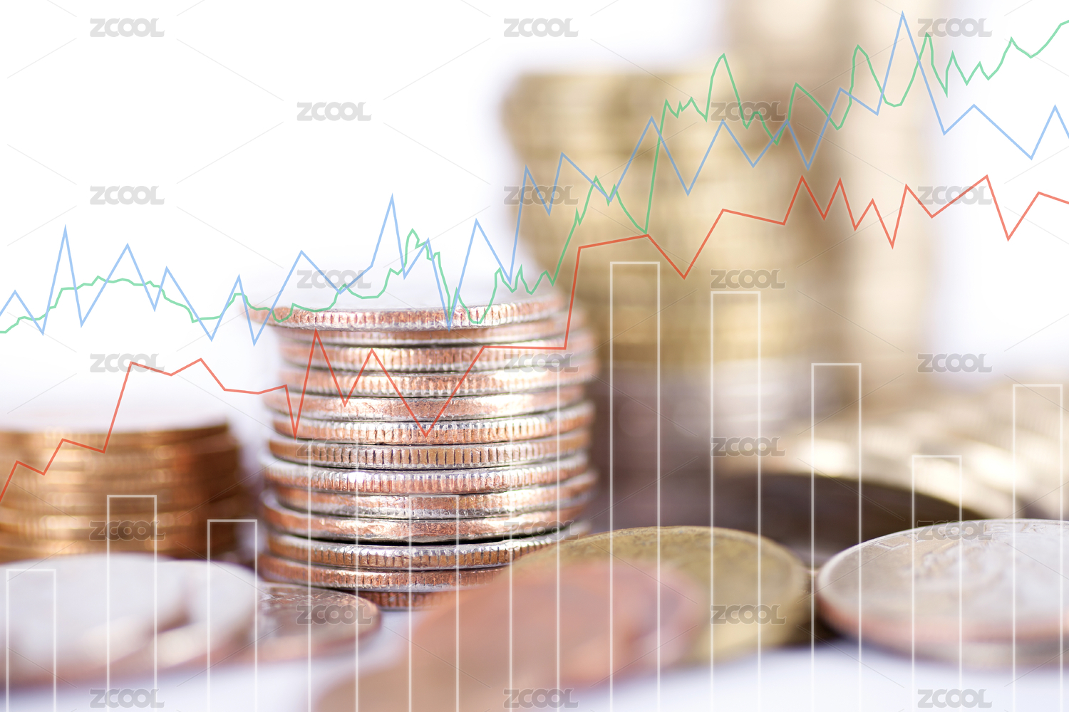 金融和经营理念。投资图形和行业动态和钱币在桌上,蓝色调。
