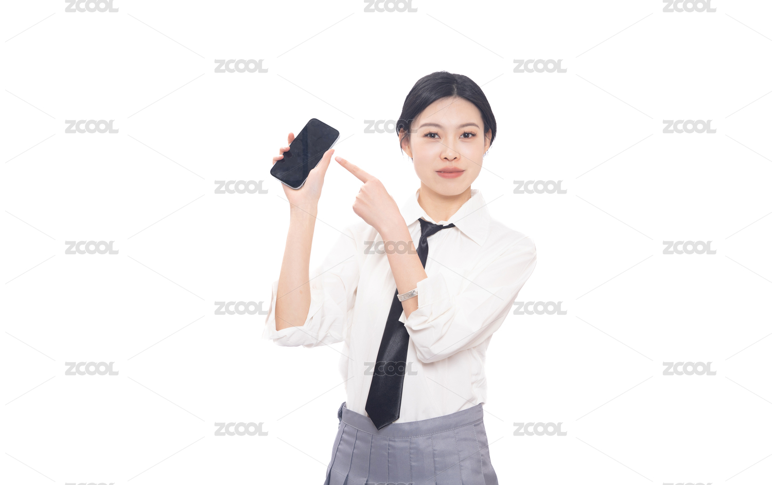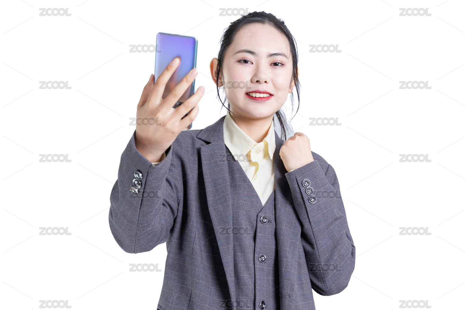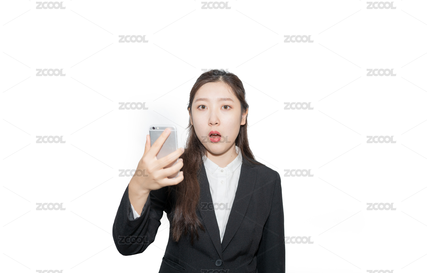 白色背景下一个穿着西服正装拿着手机吃惊的女人