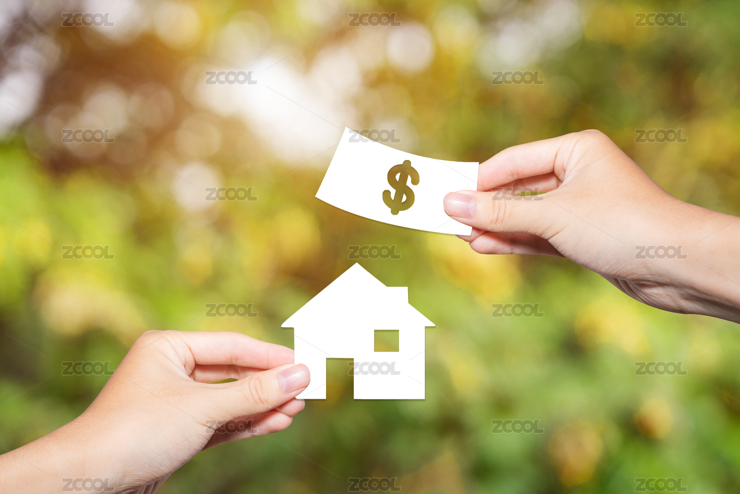 一只手托着虚拟的美元钞票和另一只手托着虚拟的小房子进行交易