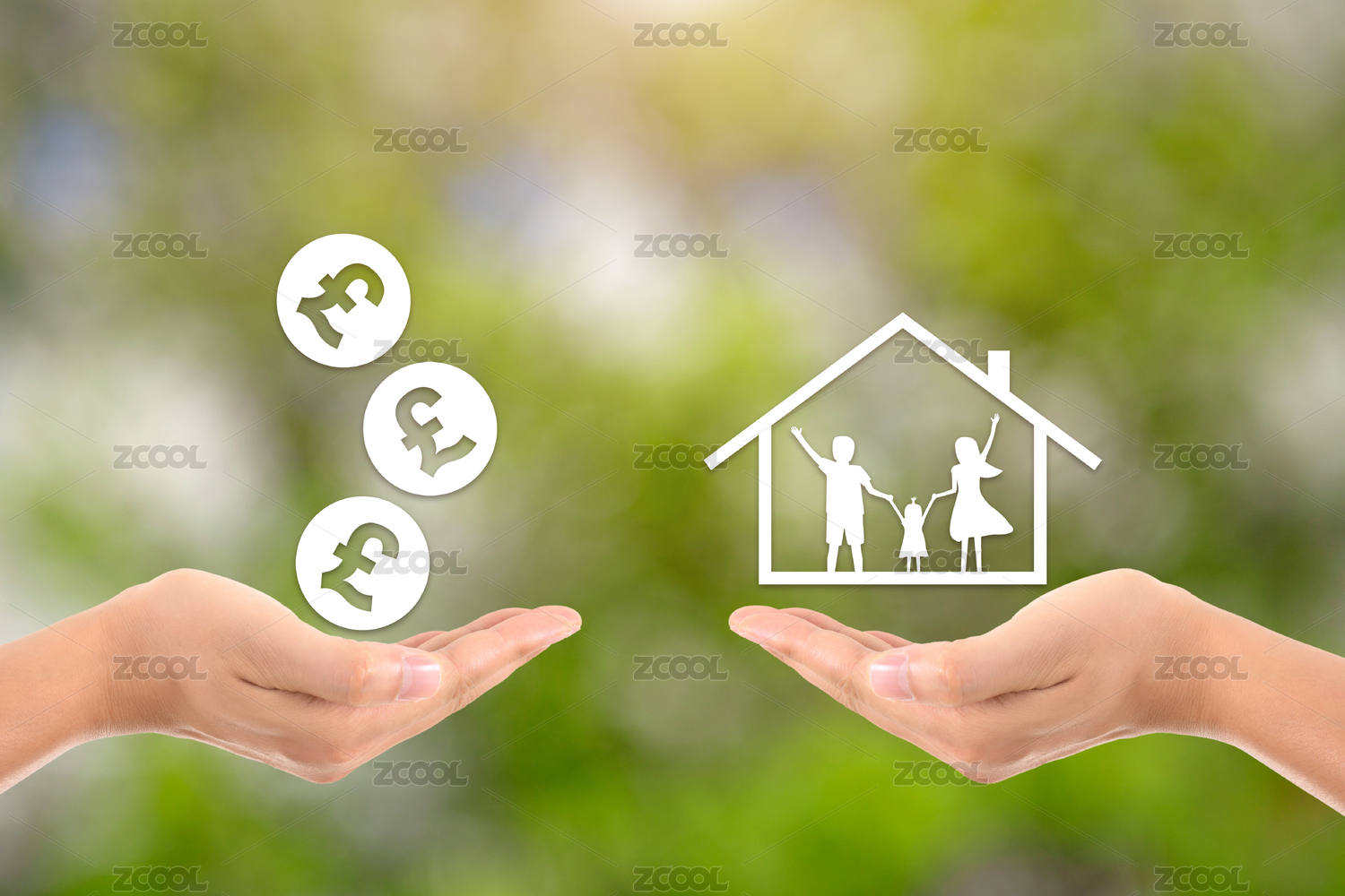 一只手托着虚拟的英镑硬币和另一只手托着装着一家三口的房子进行交易