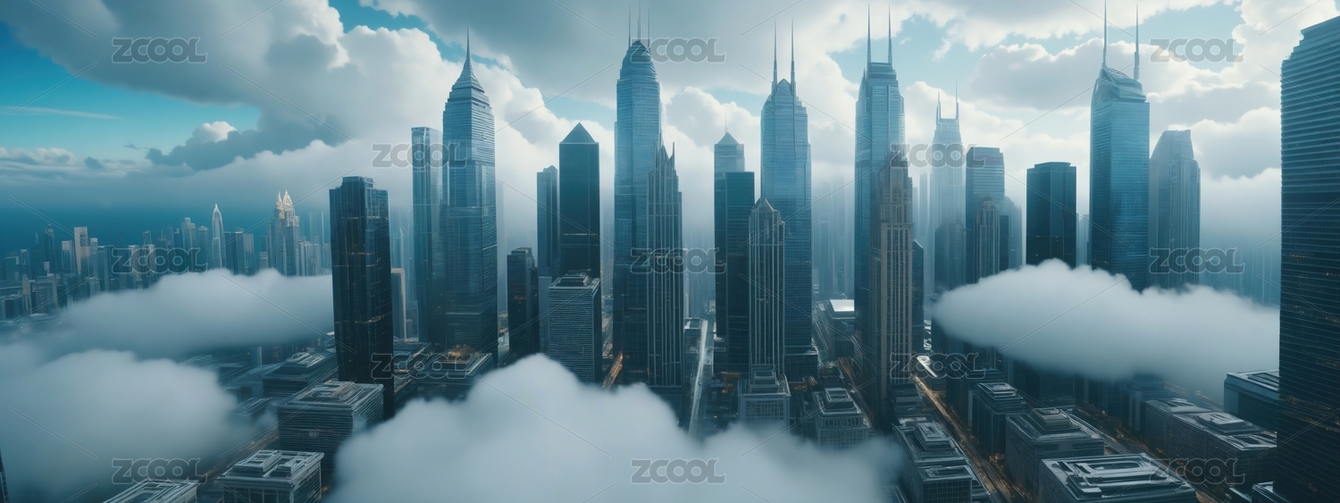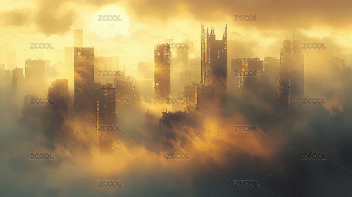 薄雾中阳光洒在摩天高楼上的城市早晨