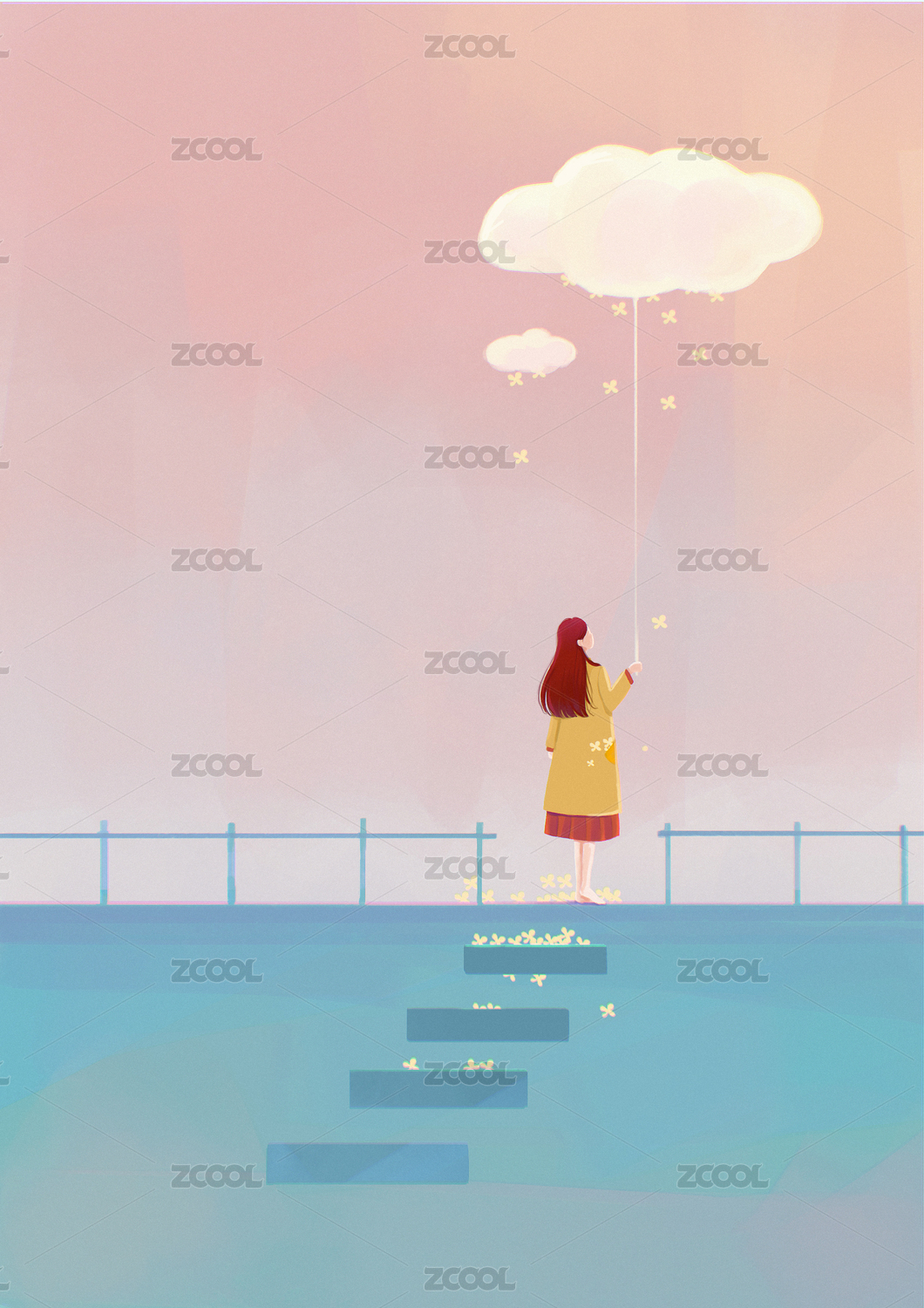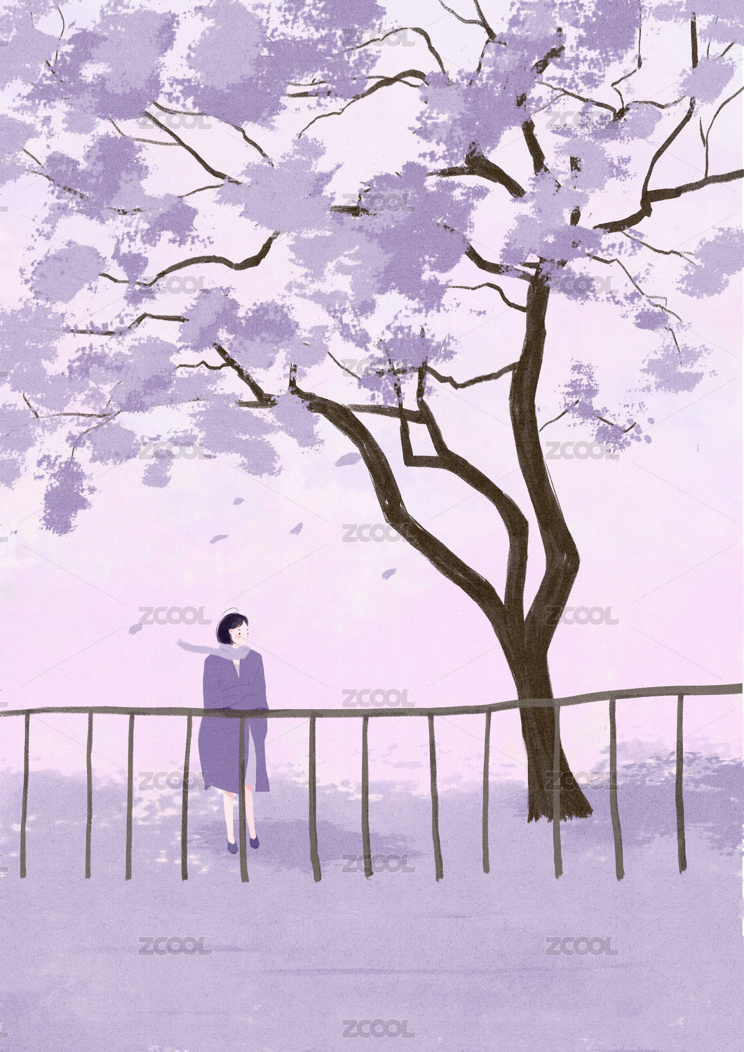 傍晚夕阳的公园树林里看书女孩和狗的插画