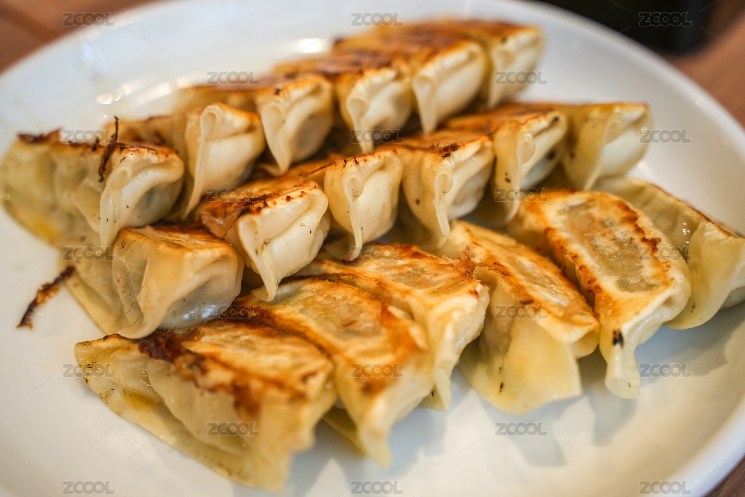 木桌背景一盘中式传统煎饺