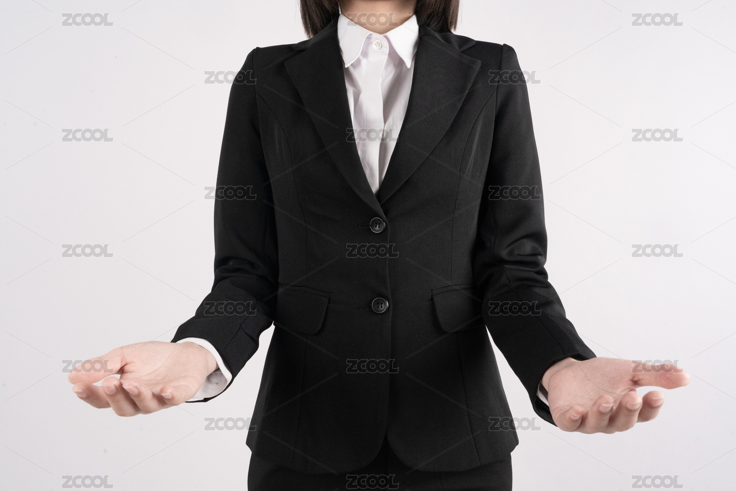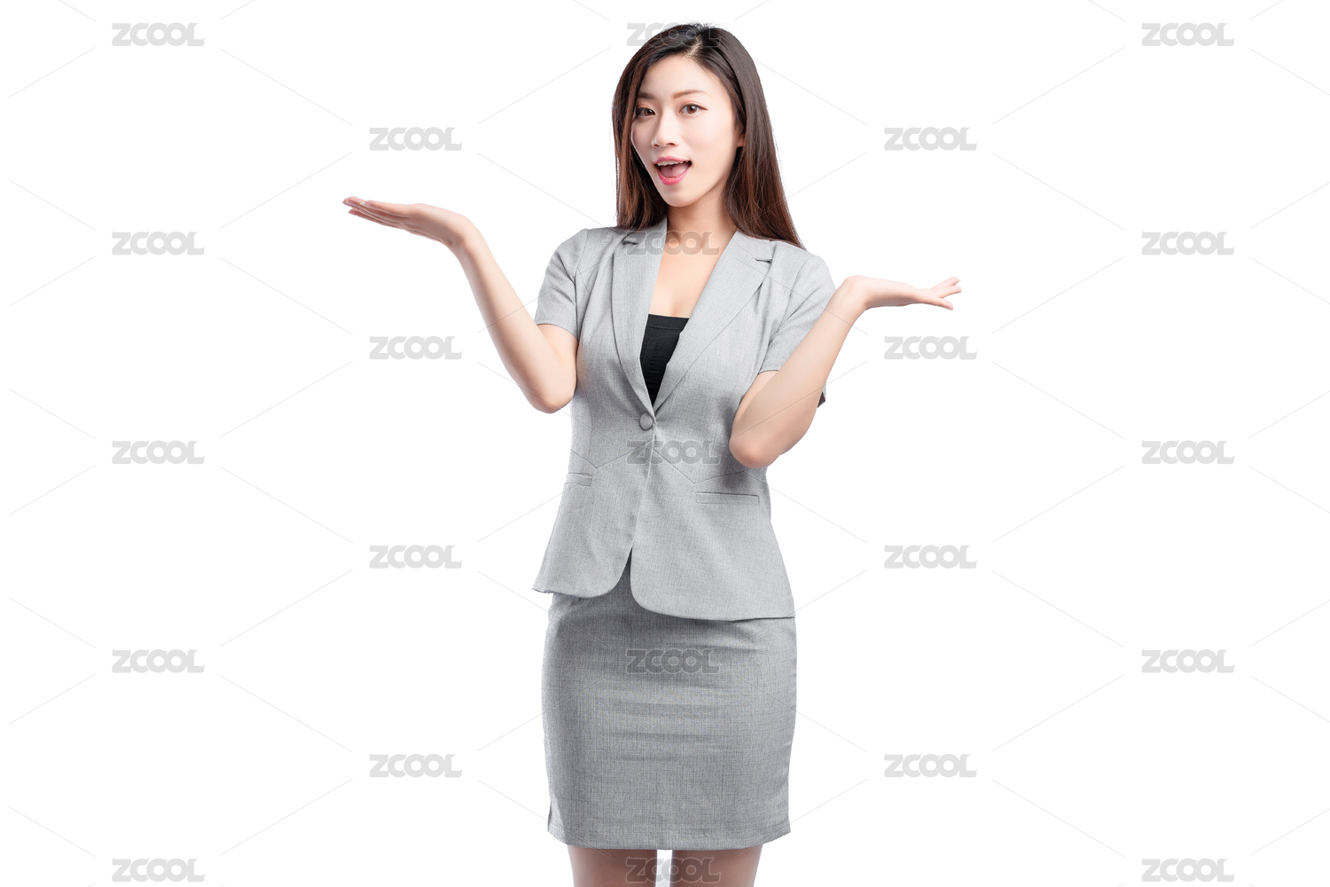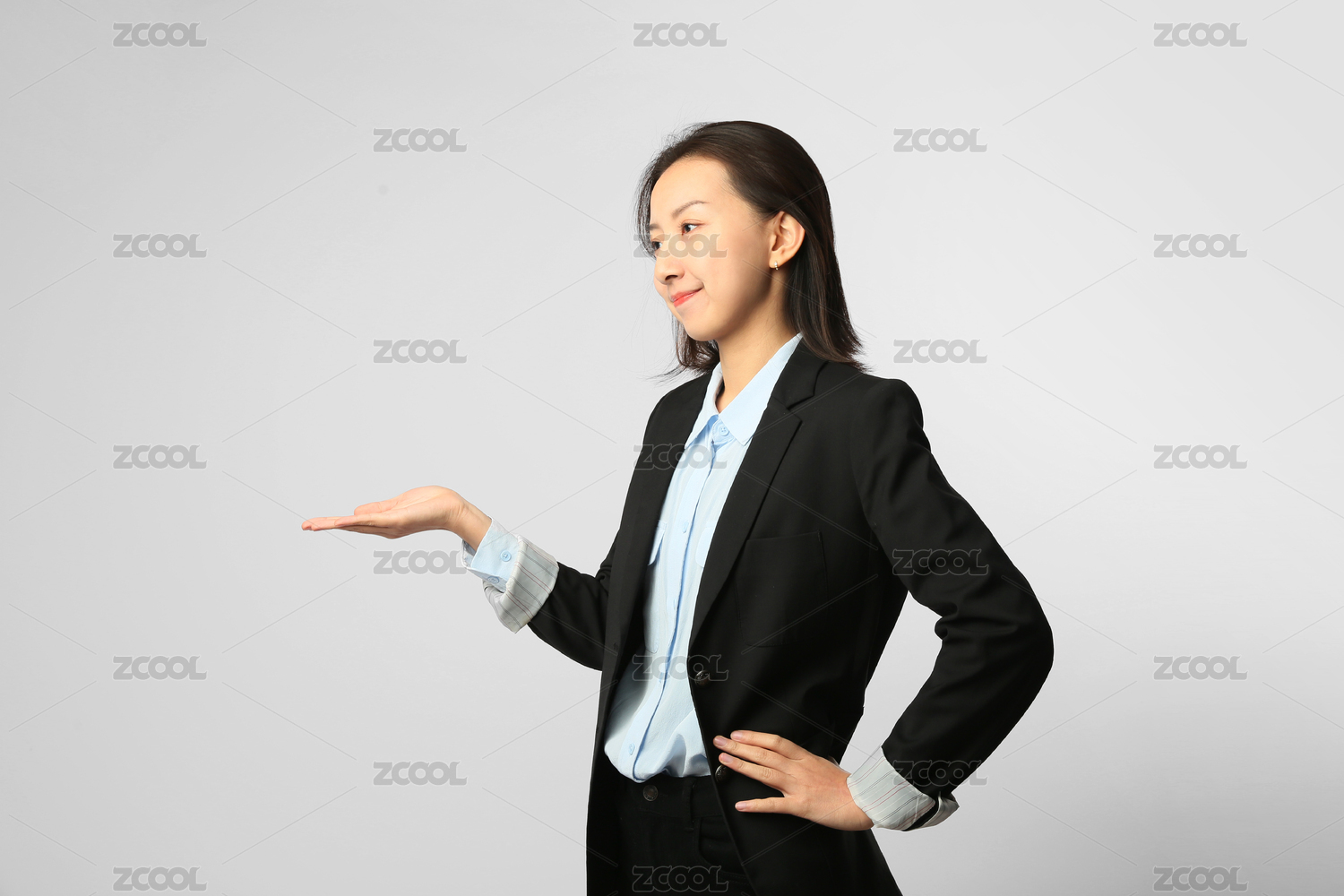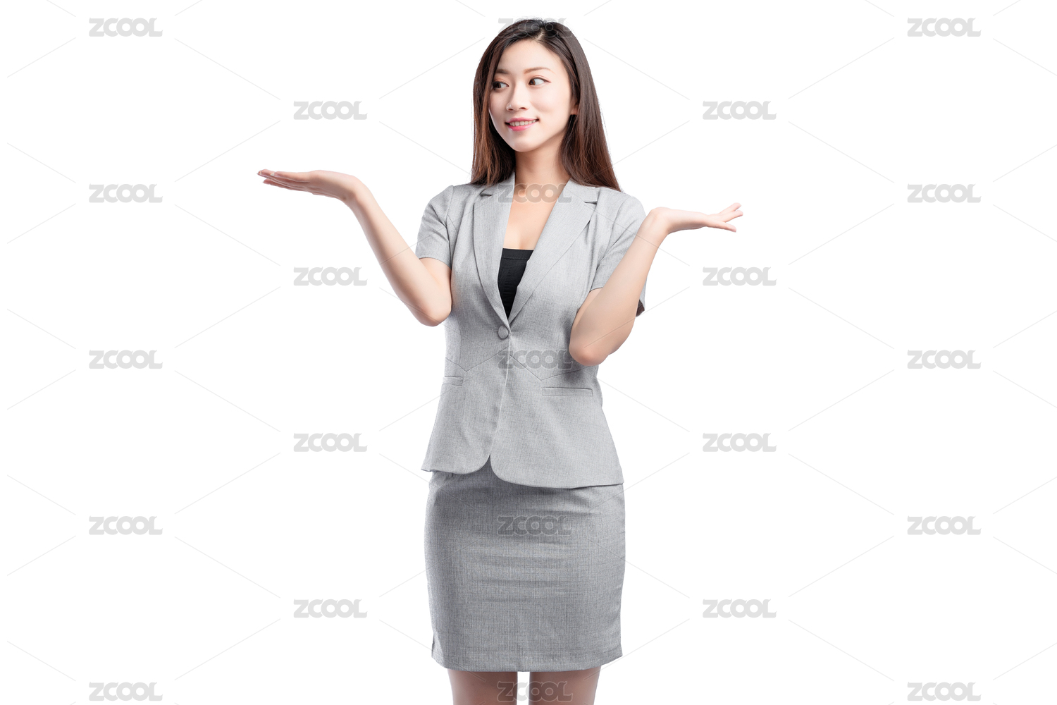 白色背景下穿着正装的美女做出热情欢迎的动作