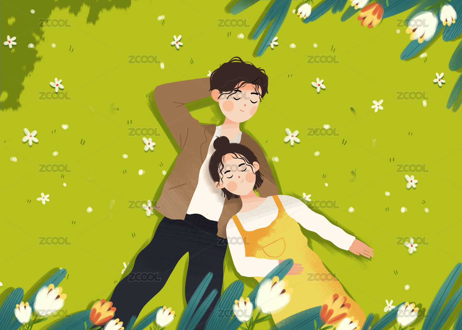 早春时节躺在草坪沐浴阳光的青年男女