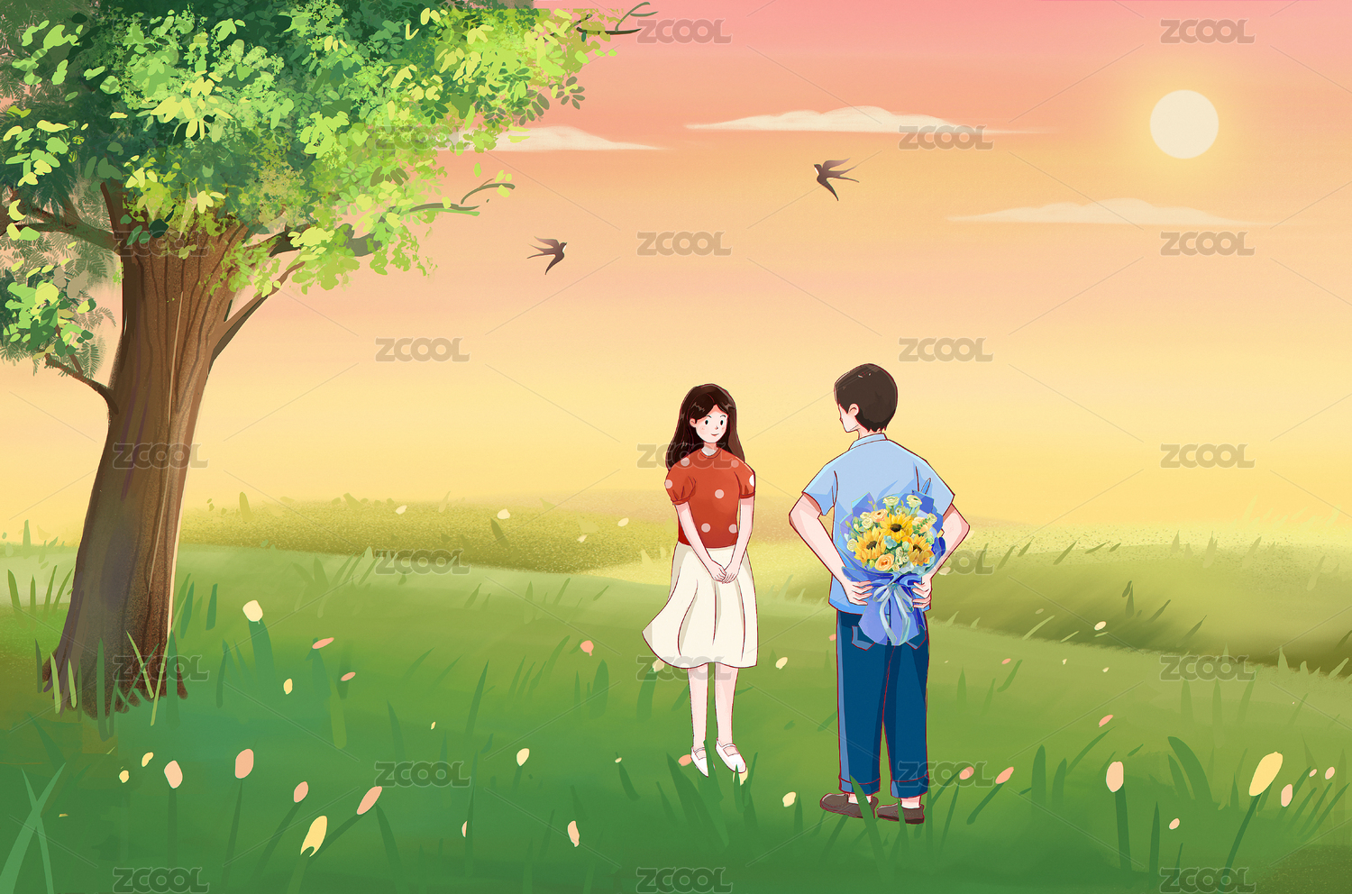 在夕阳下告白的情侣横版