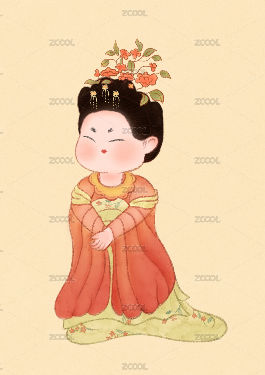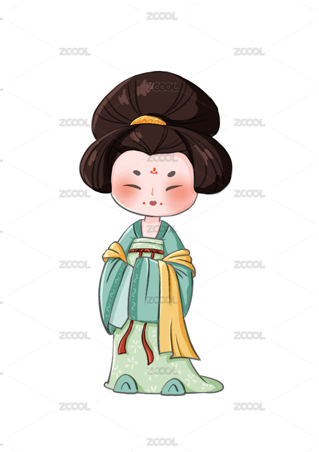 Q版可爱古代穿着汉服的唐女孩原创手绘插画