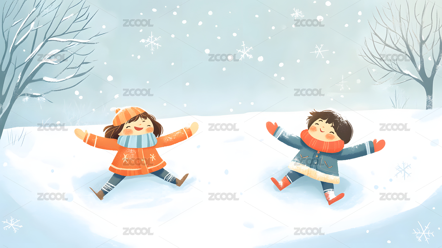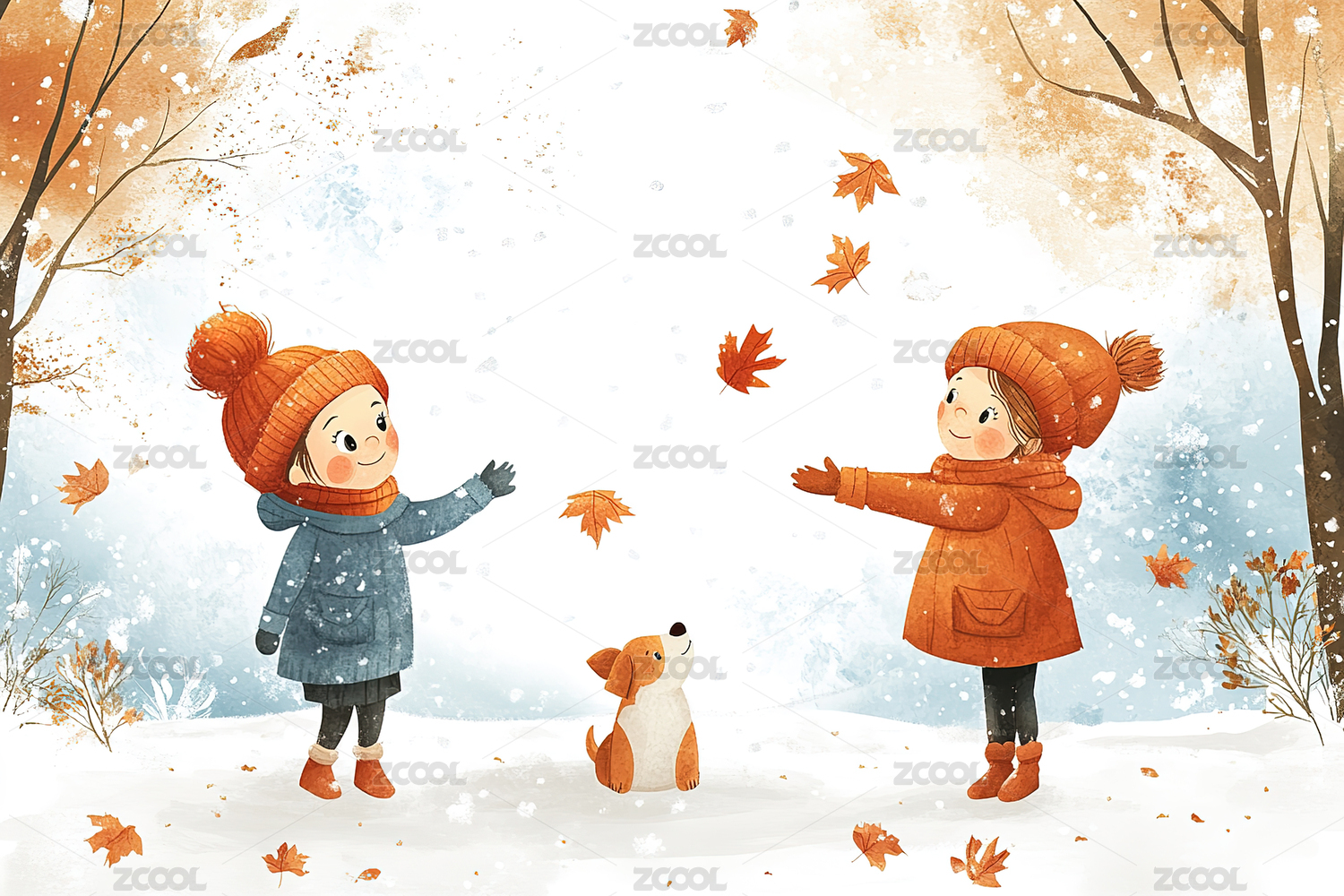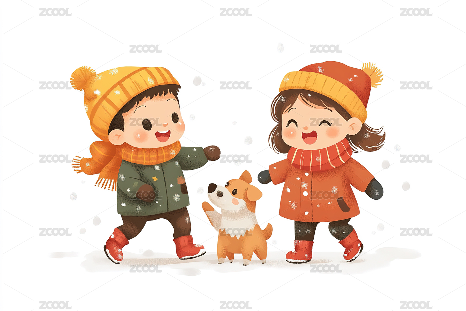 暖色调,橙色,插画,雪地,孩子,女孩,男孩,小狗,冬天,玩耍