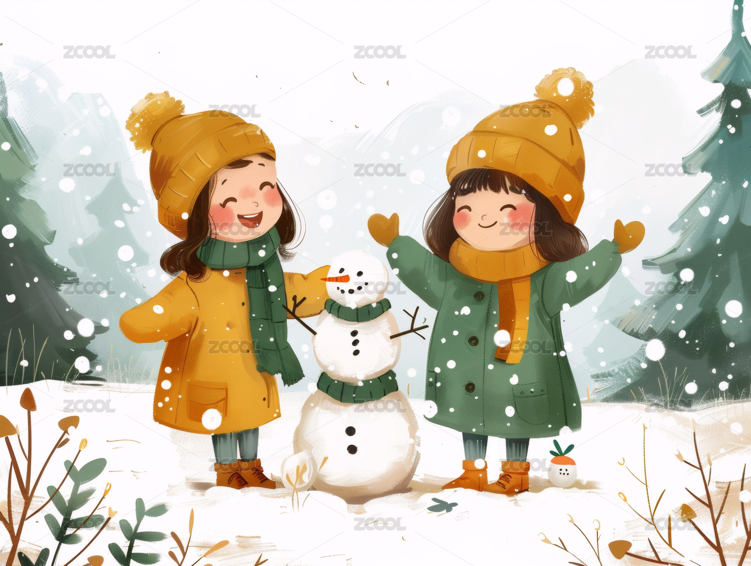 冬日雪景中,两女孩开心堆雪人,温馨又可爱