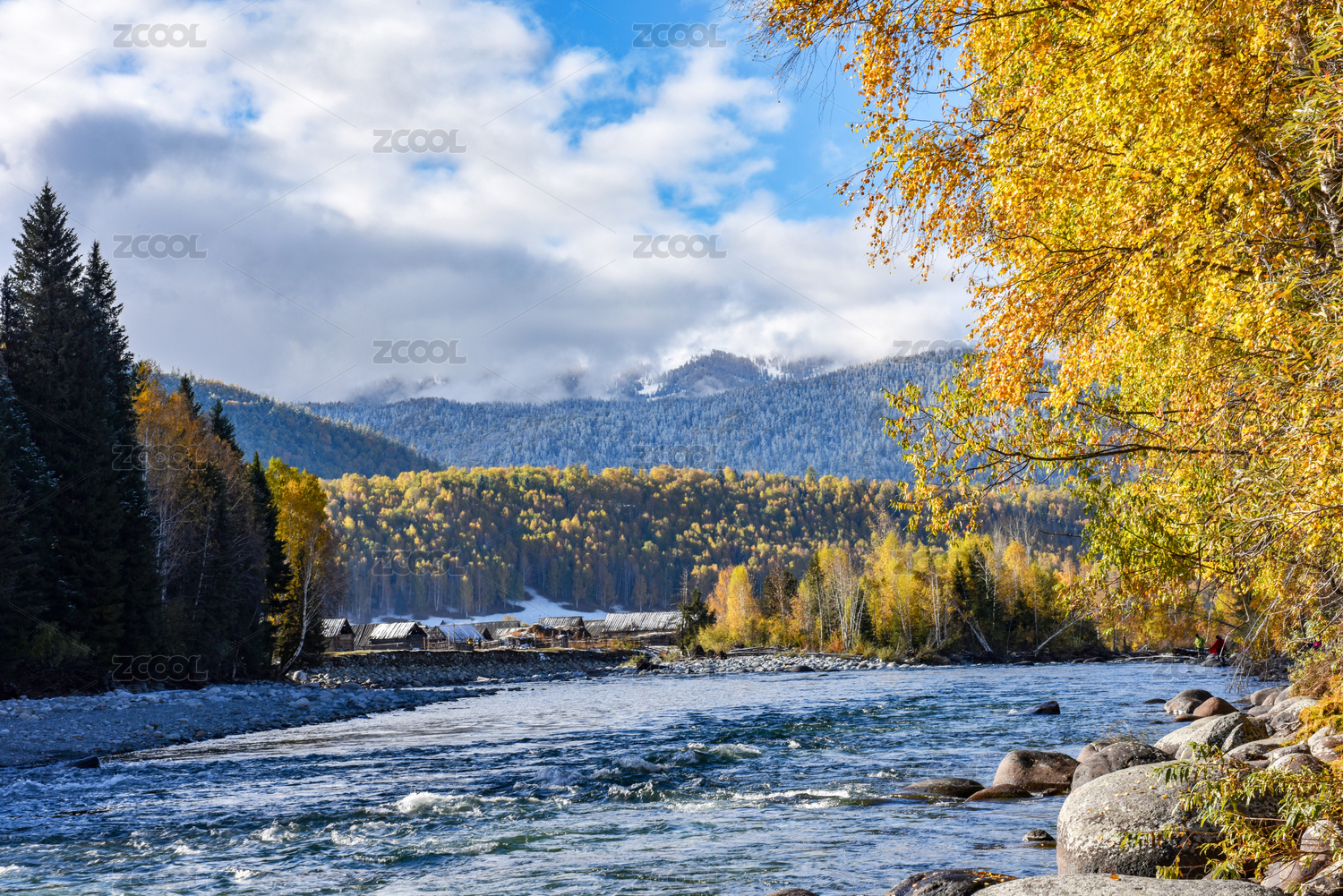 中国新疆阿勒泰可可托海额尔齐斯河溪流秋天