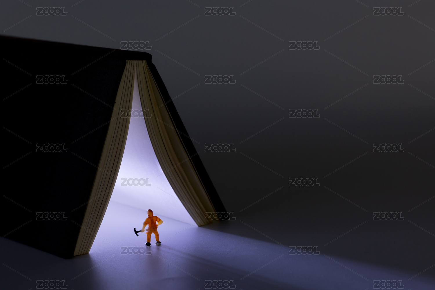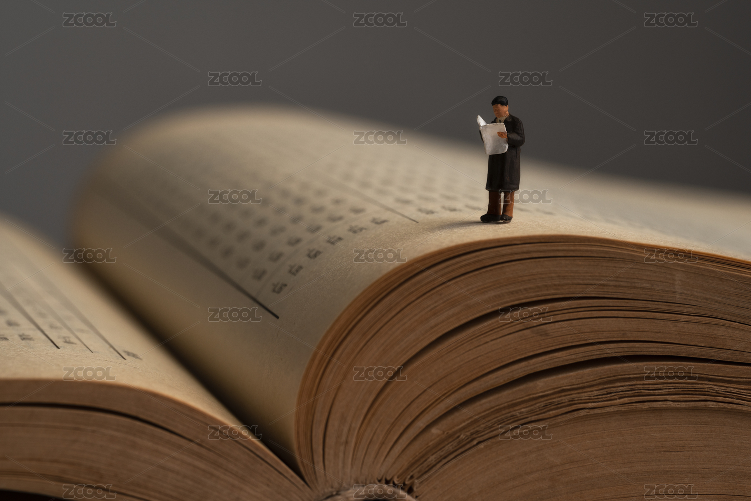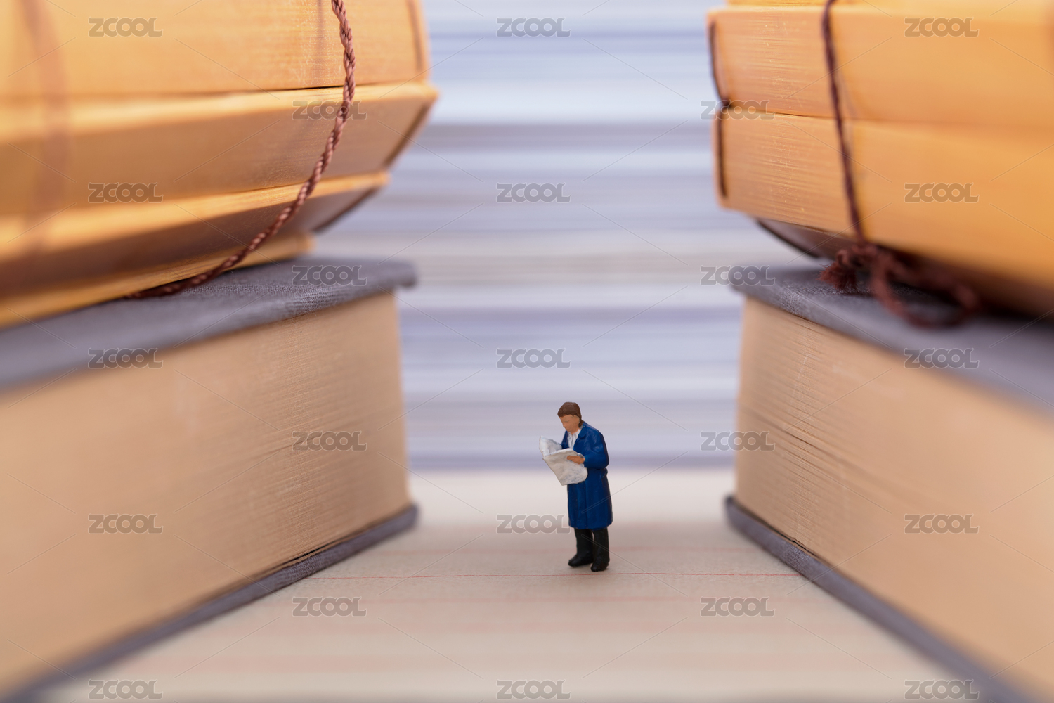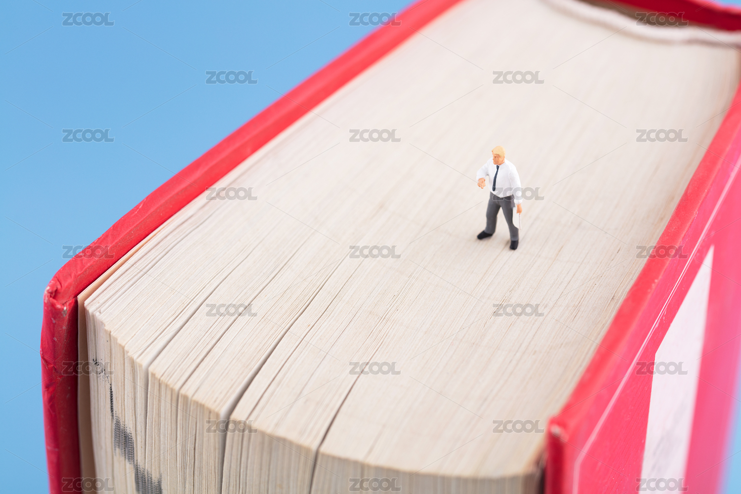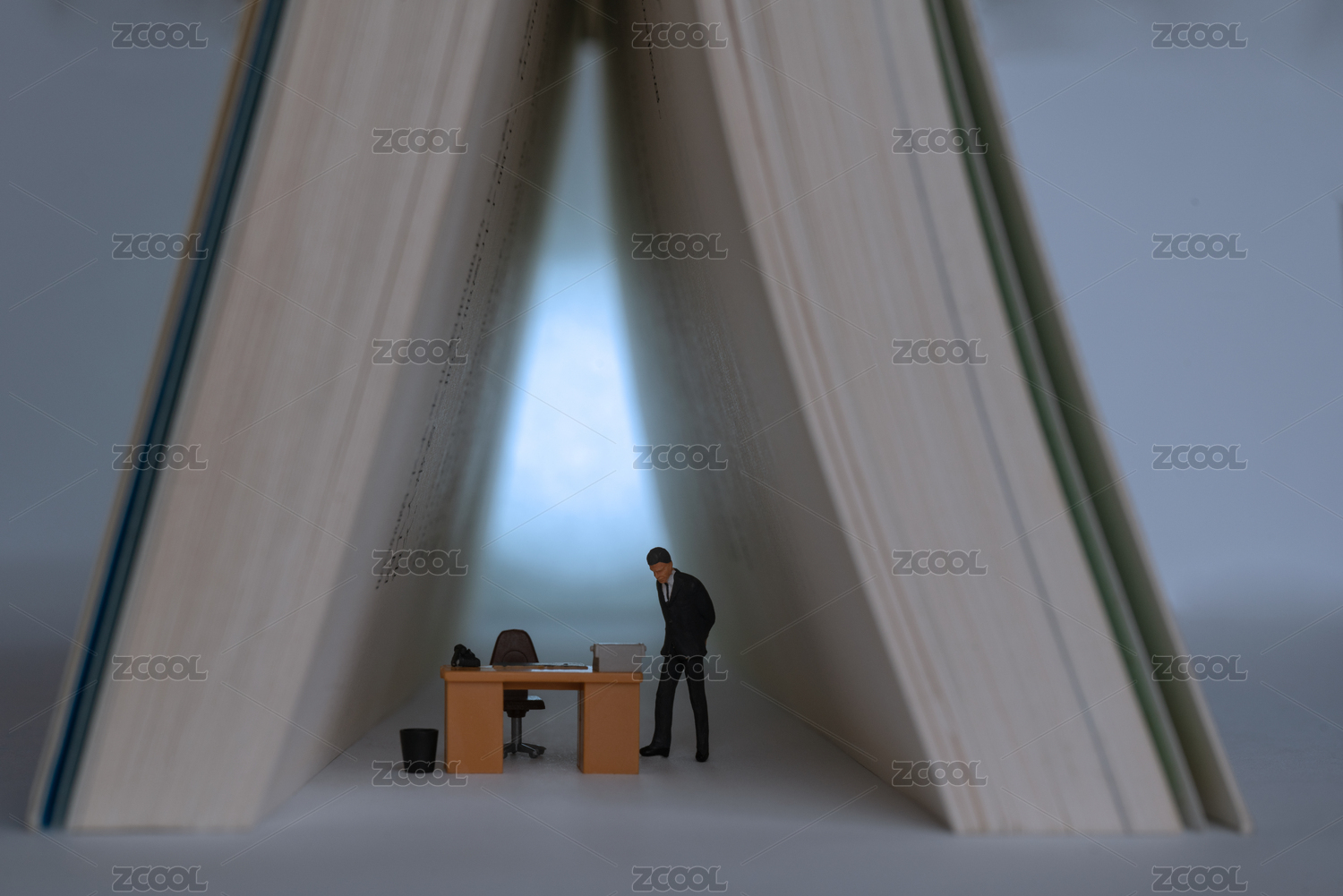 书籍内放着办公桌边站着焦虑的男士微缩创意