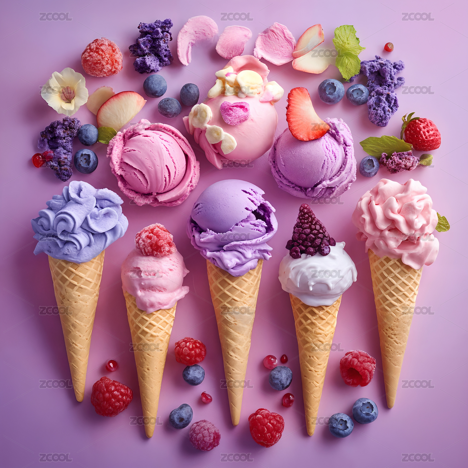 缤纷冰淇淋搭配新鲜莓果美味诱人